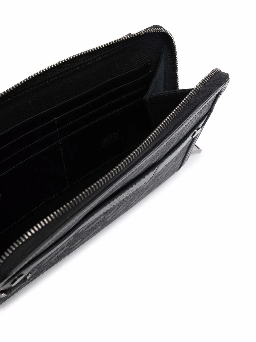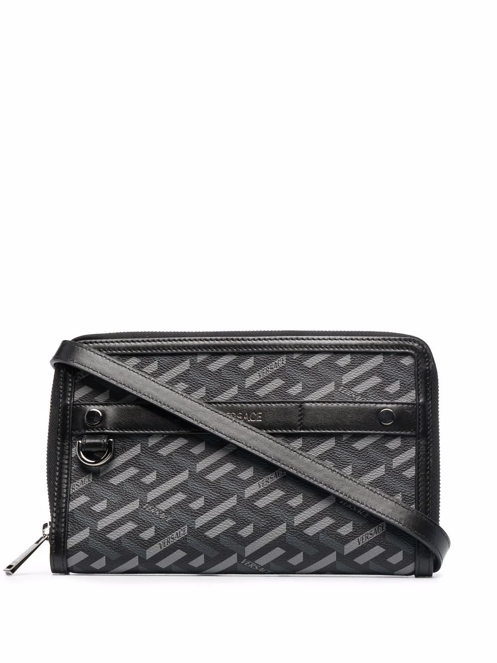 Détail Greca signature, fermeture zippée sur le dessus, finitions métalliques couleur gris acier, poche intérieure. Matière : cuir.
