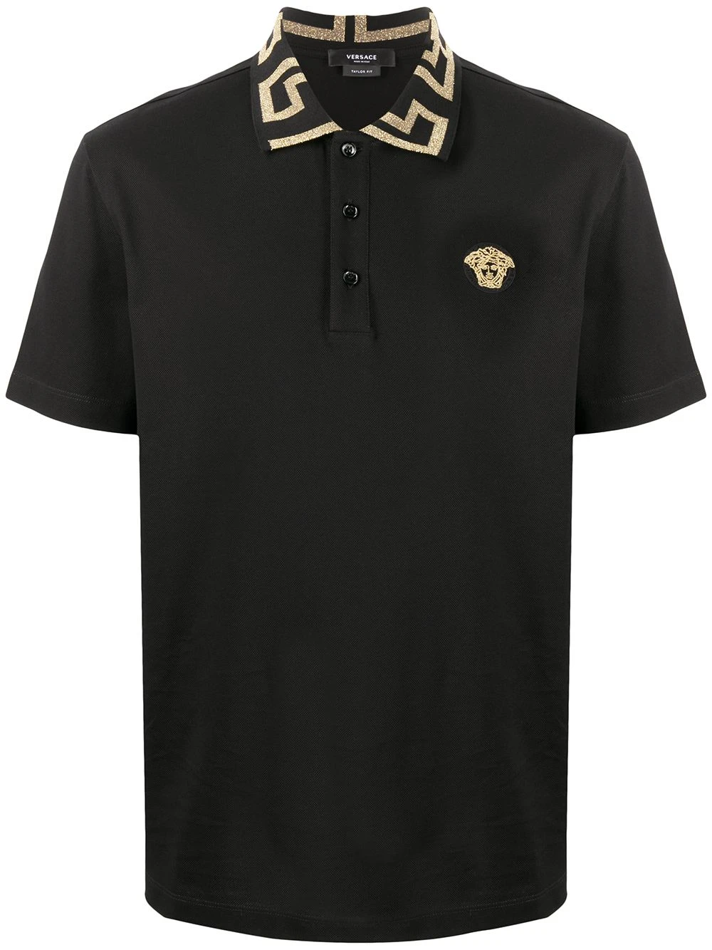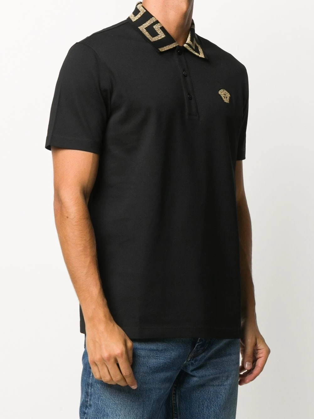 Polo en coton à col Greca Versace avec manches courtes, logo brodée sur la poitrine et col boutonné. Couleur: noir.