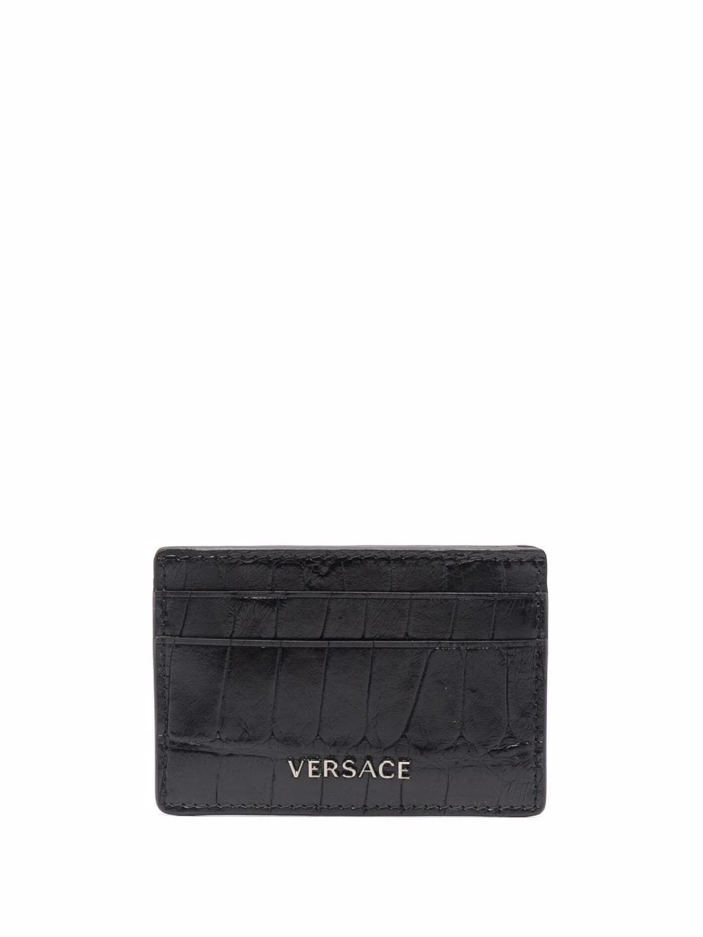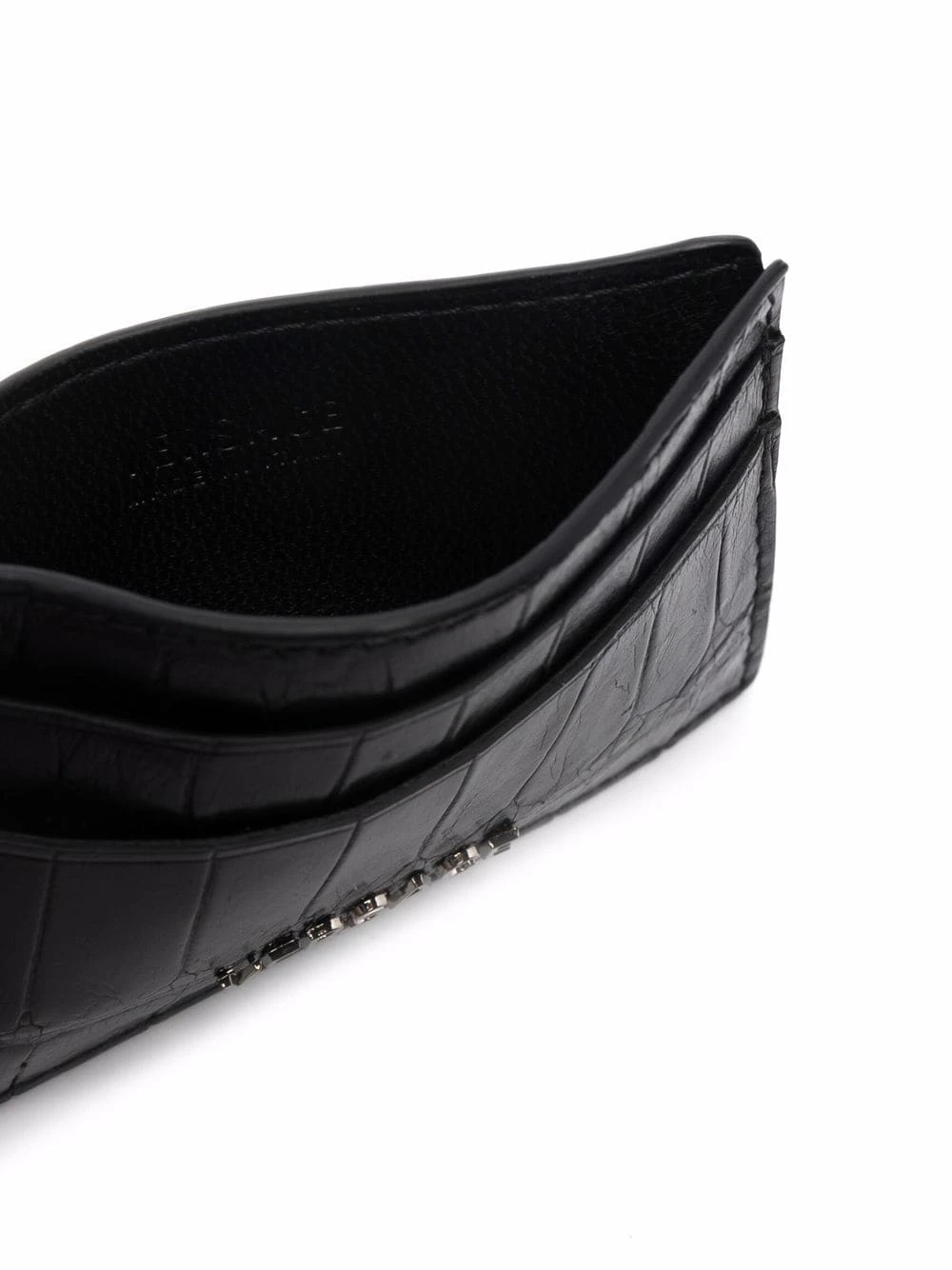 Plaque logo argentée, effet peau de crocodile, fentes pour carte, poche plaquée au centre. Couleur : noir. Matière : cuir.