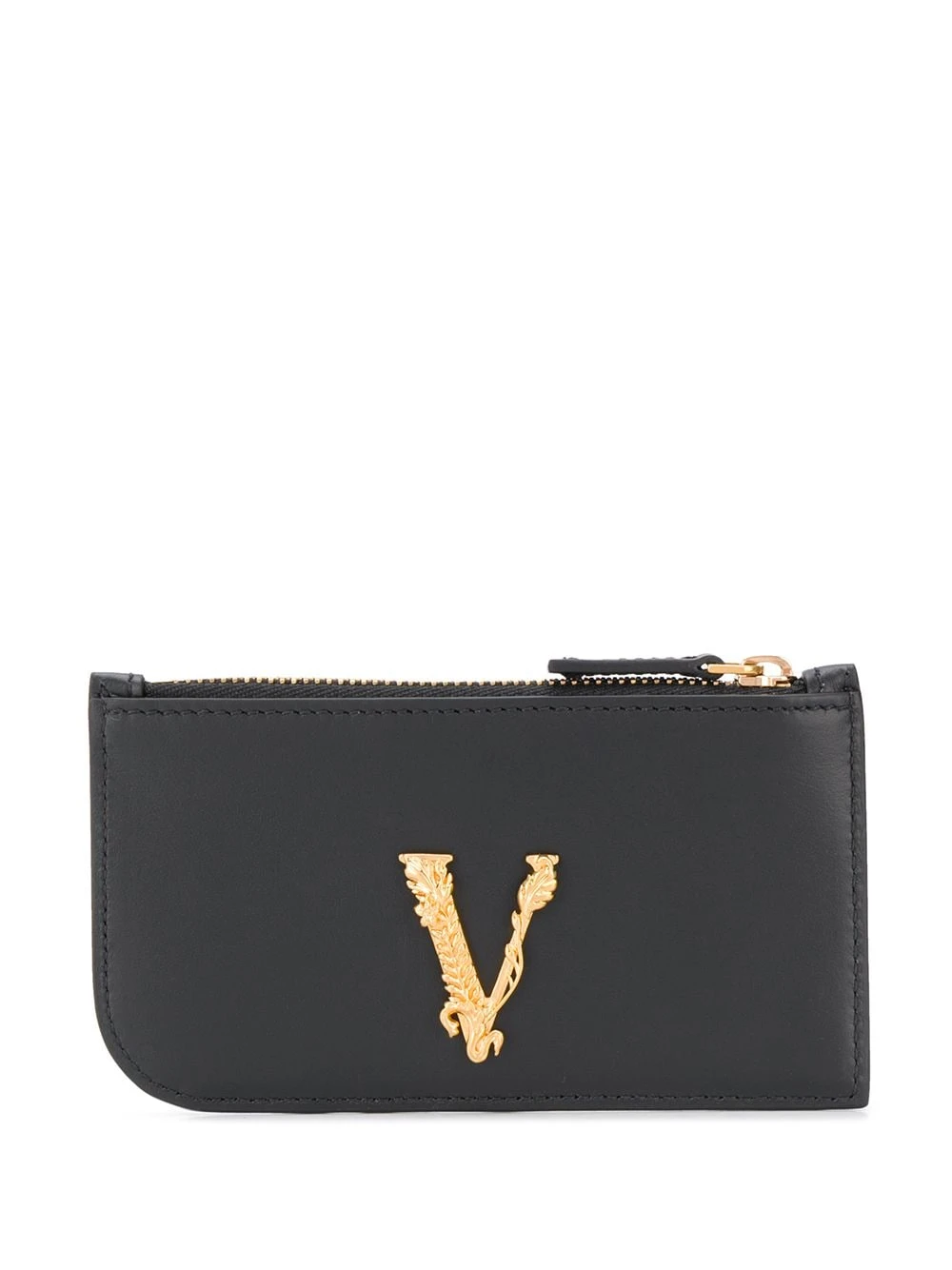 Porte-monnaie à plaque logo en cuir Versace avec plaque logo dorée, logo embossé à l’arrière, fermeture zippée sur le dessus et compartiments porte-cartes. Couleur : noir.