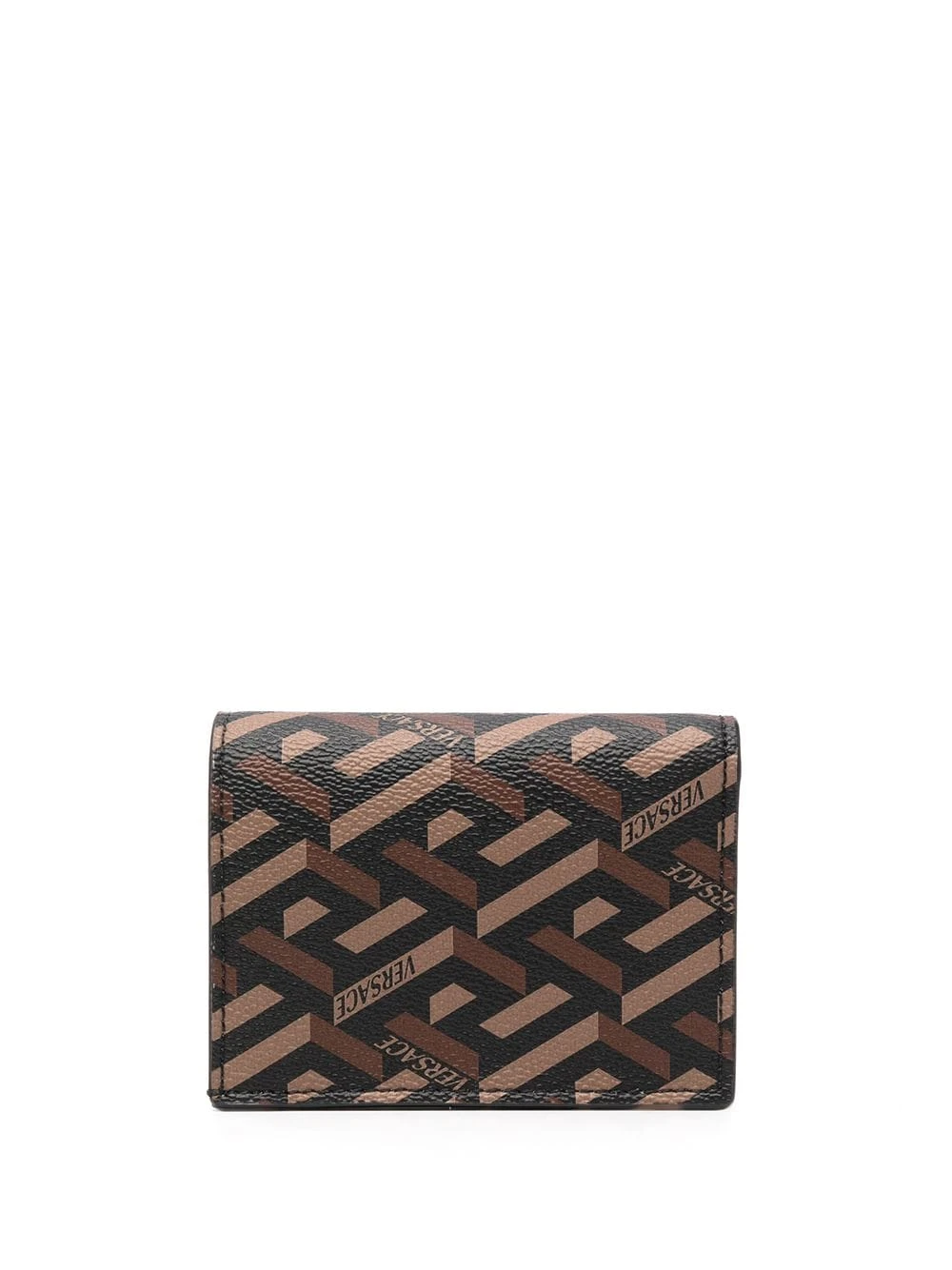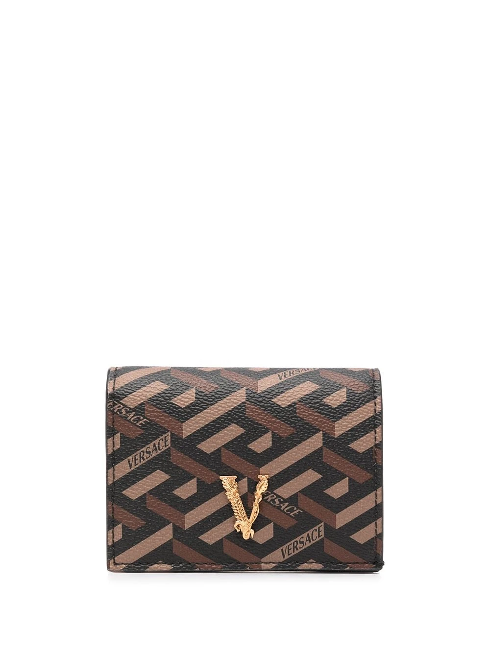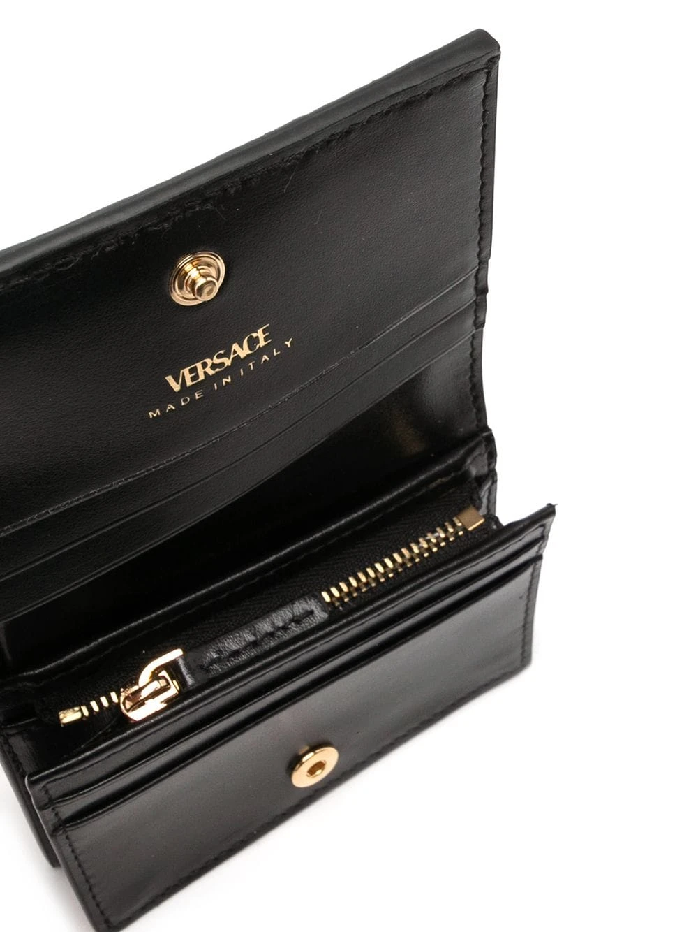 Détail de logo Virtus signature, imprimé La Greca signature, finitions en métal doré, rabat sur le dessus à boutons pression, compartiments intérieurs pour carte, poche ticket. Matière : cuir.