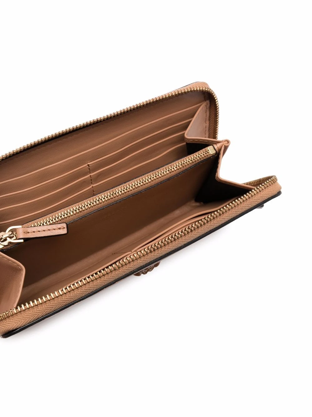 Motif Medusa, fermeture zippée tout autour, compartiments intérieurs pour carte, poche ticket. Couleur : marron. Matière : cuir de veau.