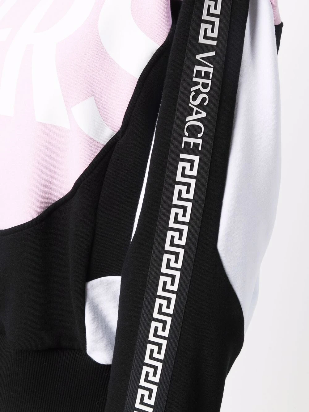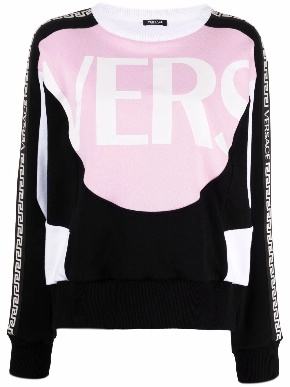 Design à empiècements, motif Greca signature imprimé, encolure ronde, manches longues, logo imprimé sur le devant, finition à bande logo, bord en maille côtelée.