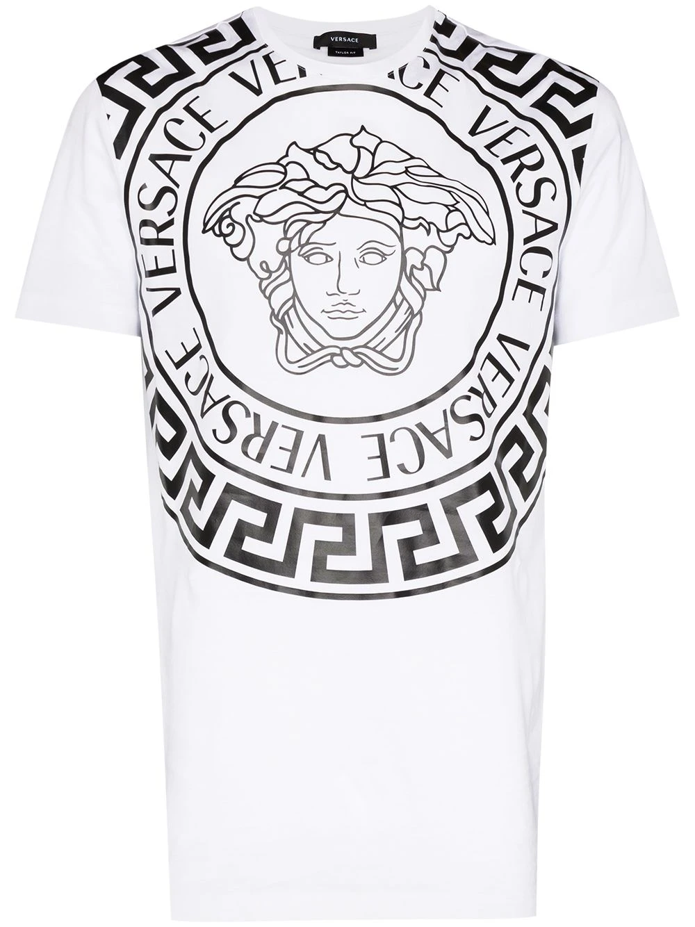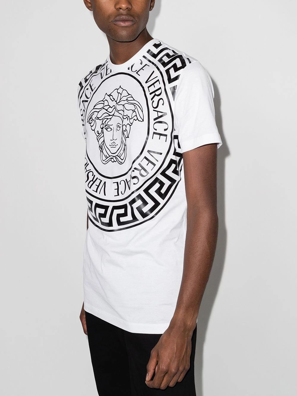 Tricot point jersey, motif Medusa, détail Greca signature, encolure ras du cou, manches courtes. Matière : coton.