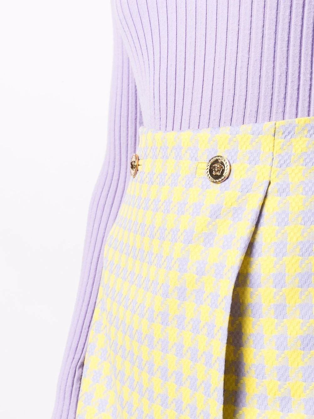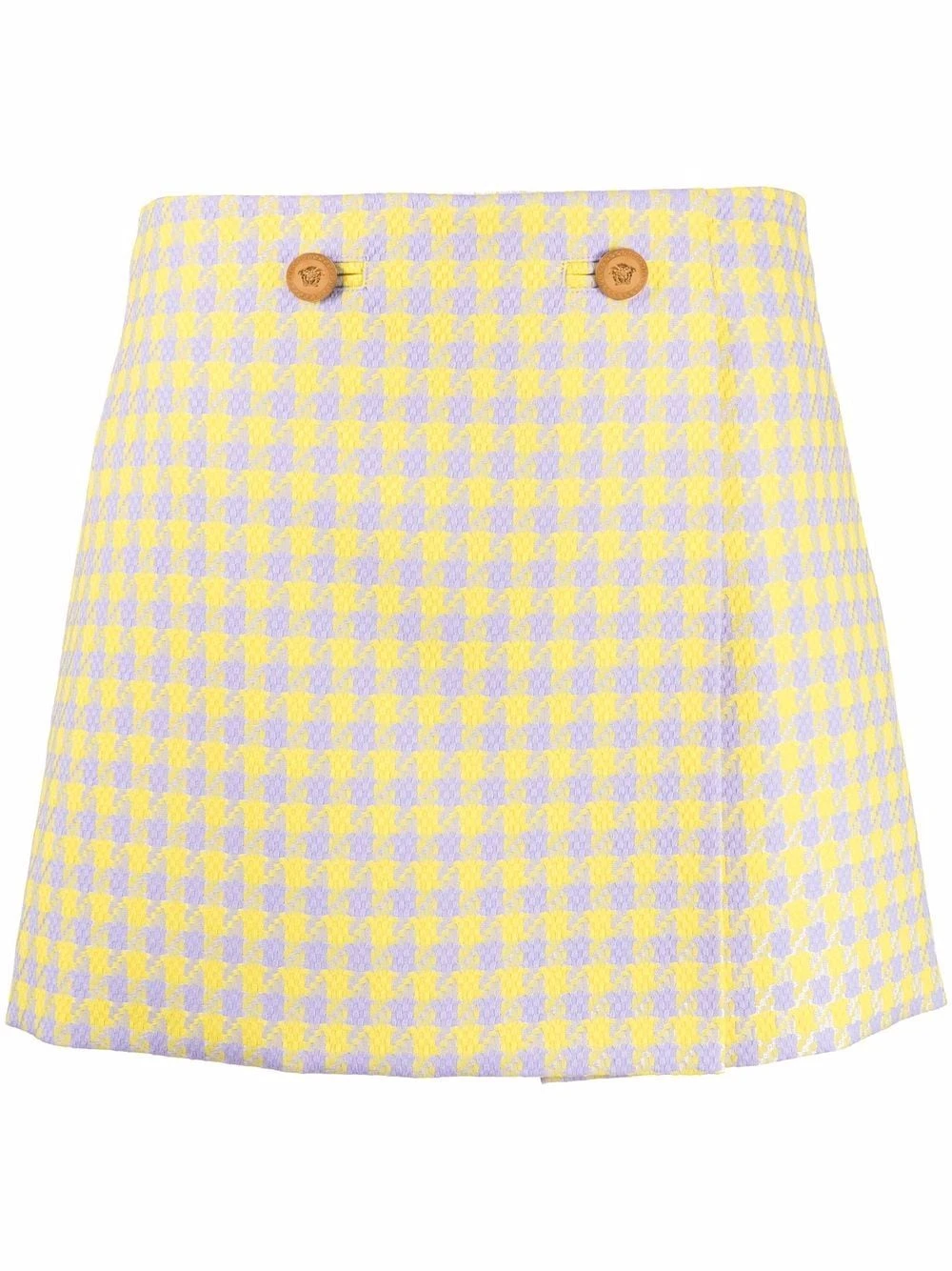 Carreaux, motif Medusa, boutons à logo embossé, design portefeuille, taille mi-haute, longueur au dessus du genou. Matière : laine vierge.