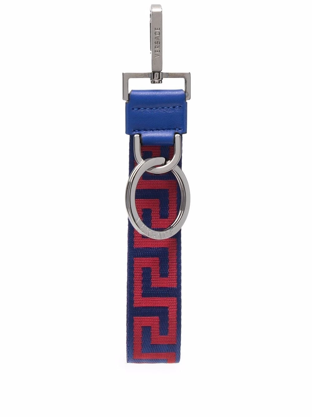 Liseré en cuir, détail Greca signature, anneau porte-clés, fermoir mousqueton, logo gravé, ornements argentés.