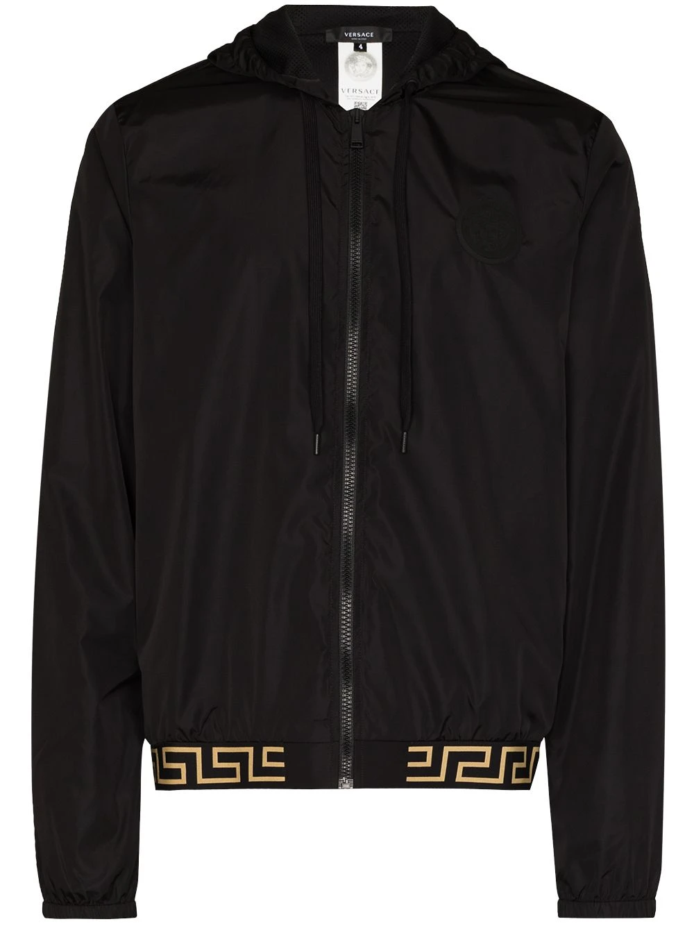 Noir, structure légère, détail Greca signature, patch poitrine à logo, capuche à lien de resserrage, fermeture zippée devant, manches longues, ourlet élastiqué.