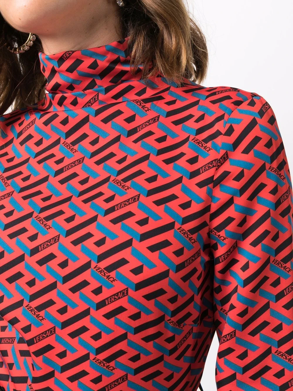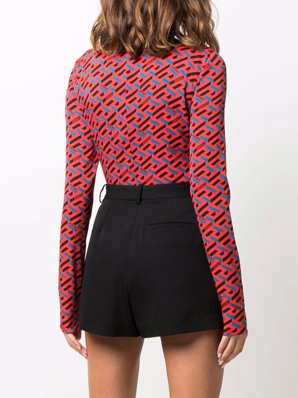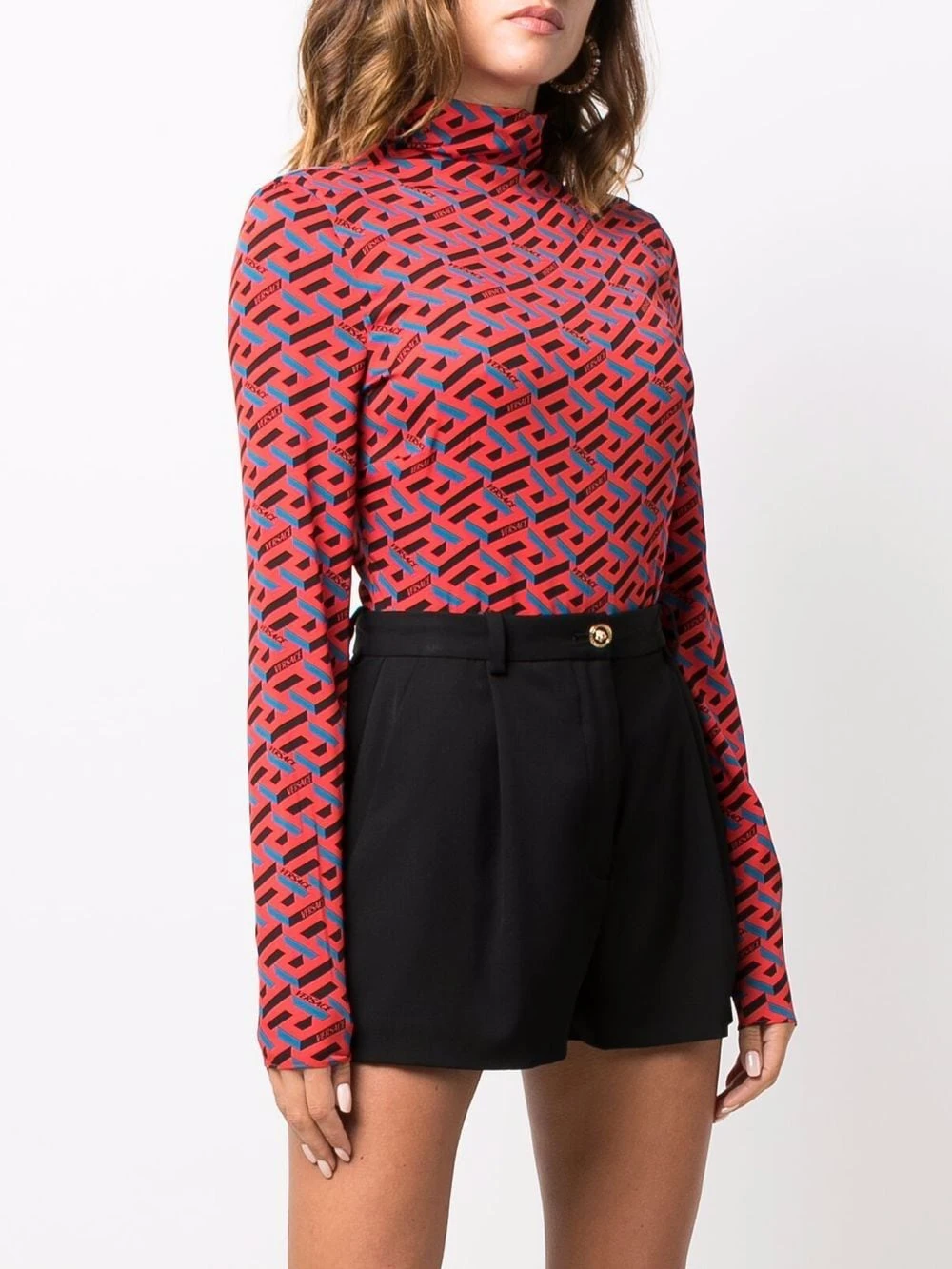Motif géométrique, imprimé monogrammé, col montant, manches longues. Couleur : rouge.