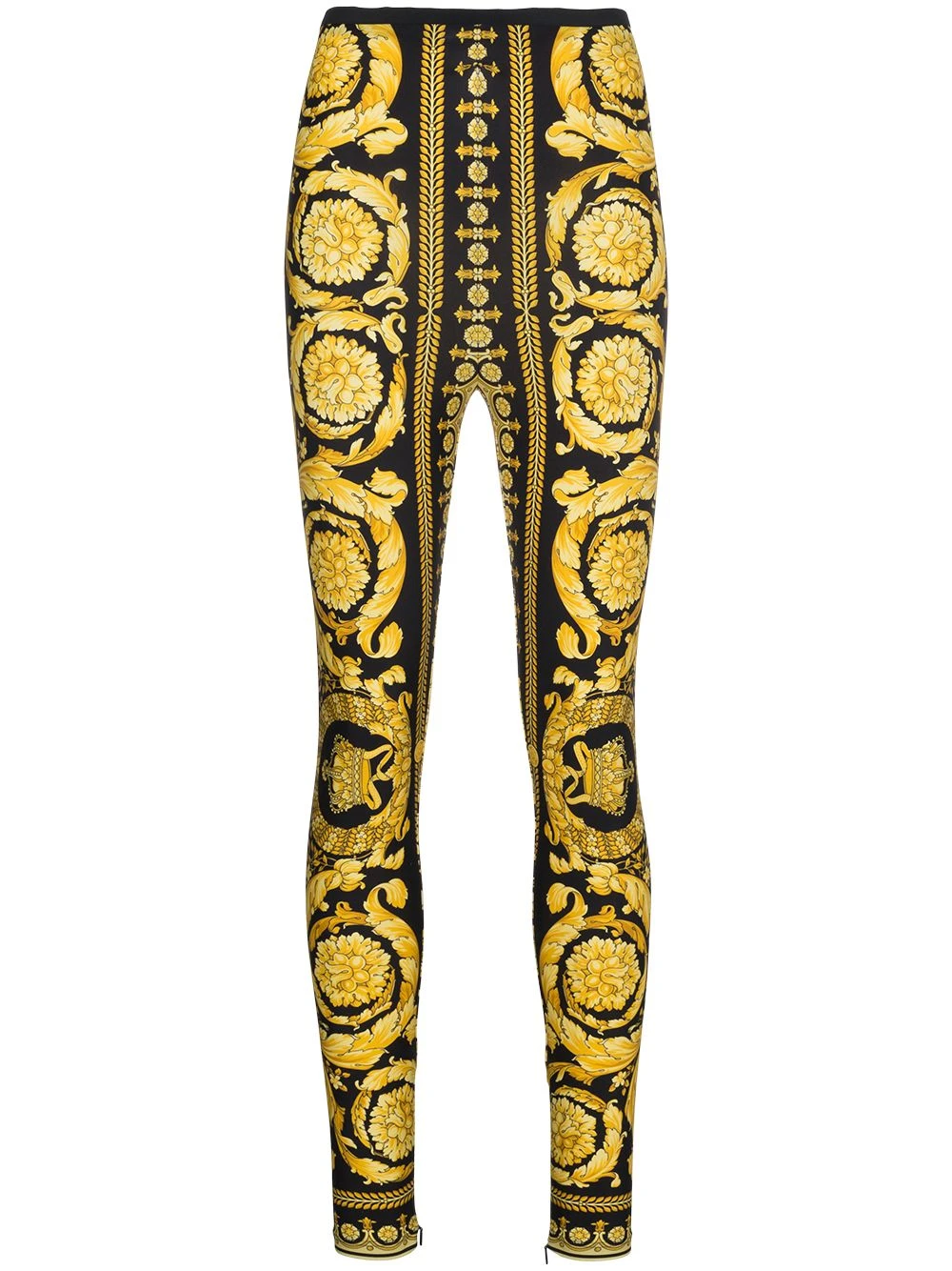 Legging imprimé Barocco FW ’91 noir et jaune Versace avec taille haute et coupe stretch.