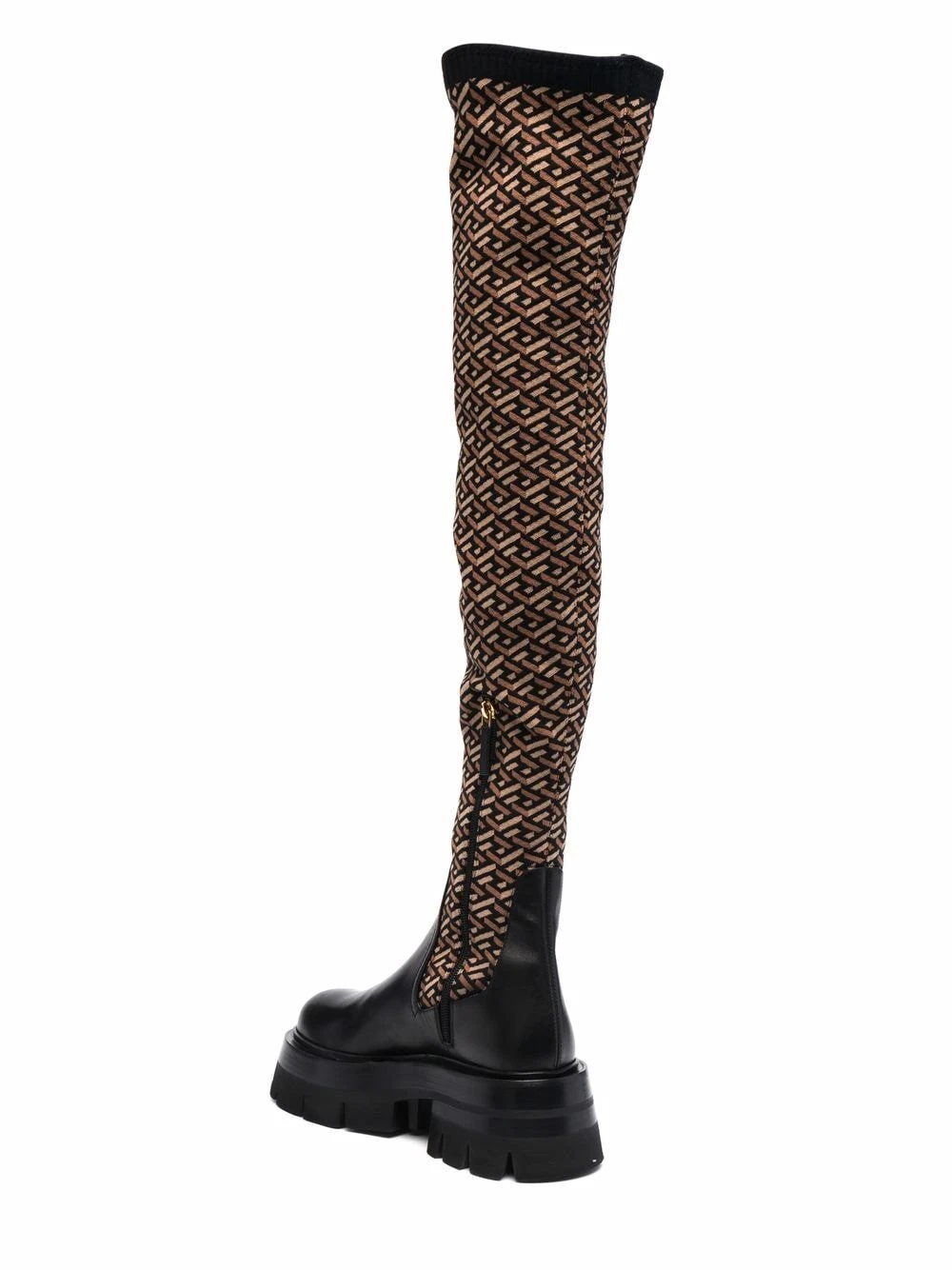 Détail Greca signature, hauteur genou, bout rond, semelle épaisse en caoutchouc.