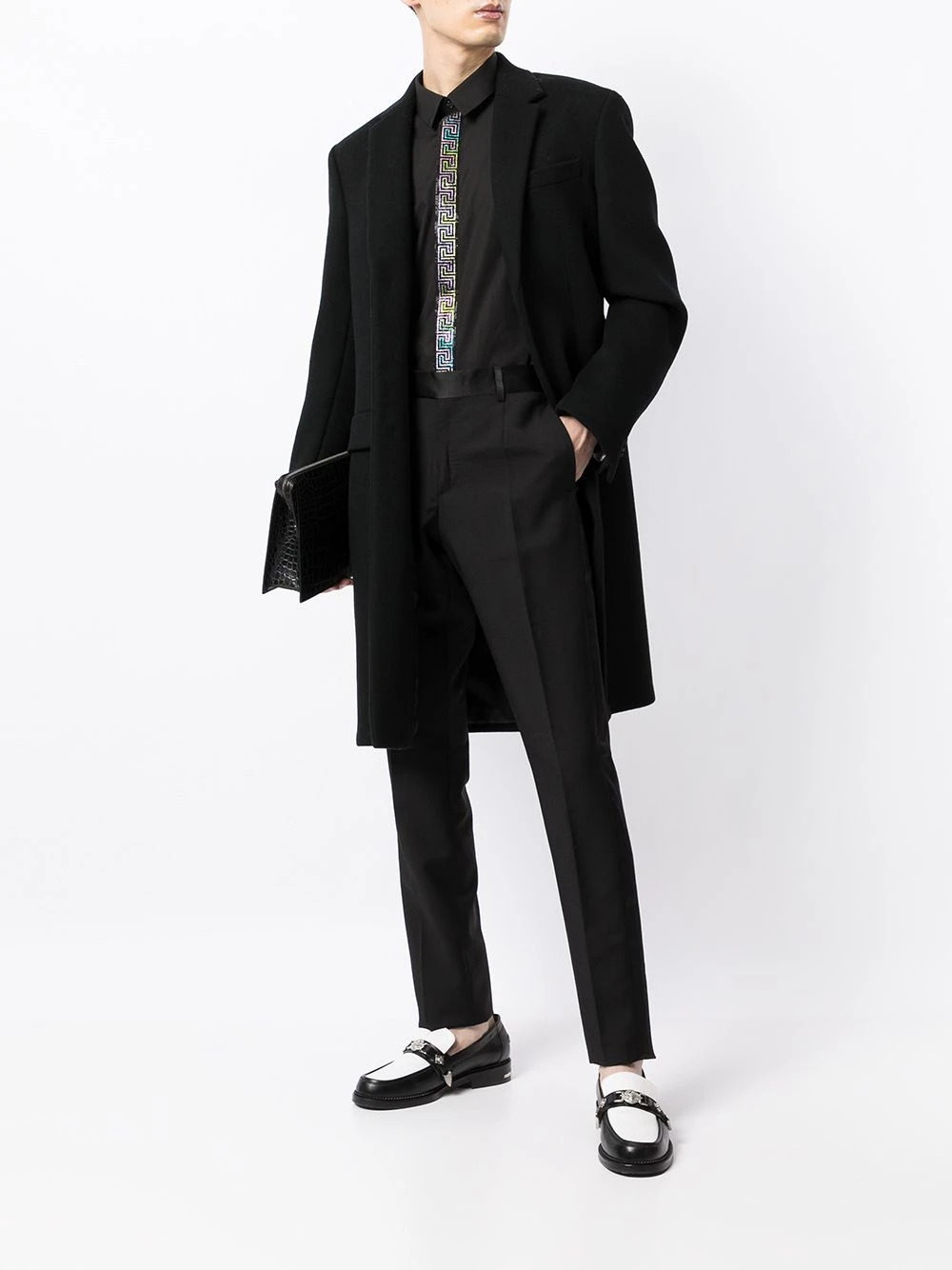 Noir, coton, détail Greca signature, ornement en strass, col classique, boutonnière dissimulée sur le devant, manches longues, poignets boutonnés.