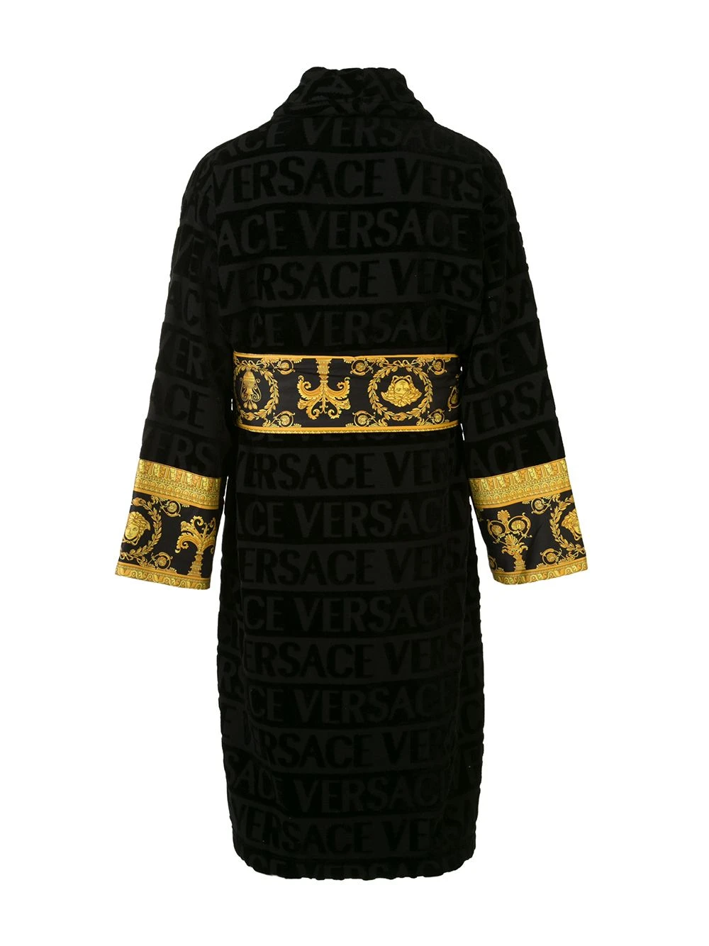 Peignoir à détail de motif Barocco en coton Versace Home avec devant à effet portefeuille, manches longues, ceinture nouée, poches devant et forme détendue.