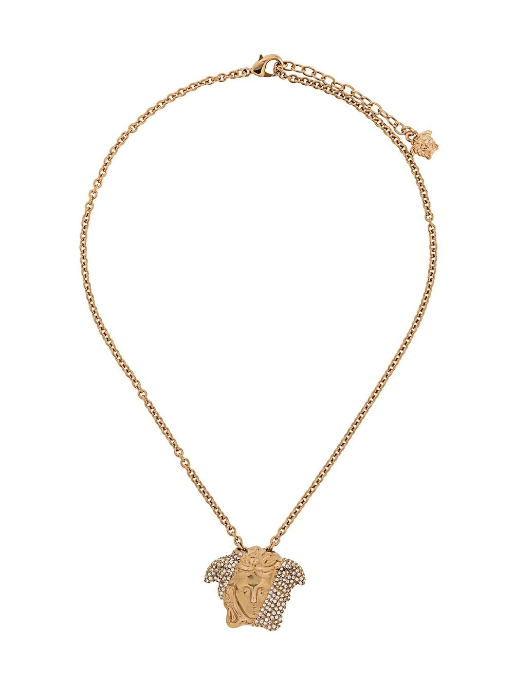 Fermoir mousqueton, chaîne à longueur ajustable, ornement en cristal, motif Medusa. Couleur : doré. Matière : métal.