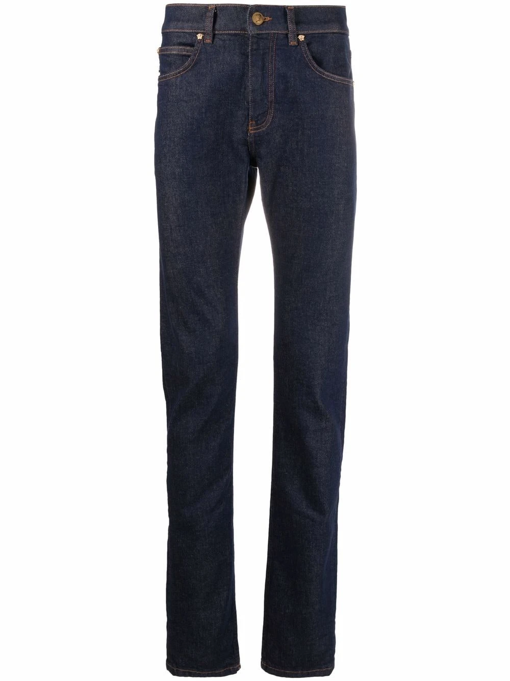 Patch logo sur l’arrière, coutures contrastantes, passants de ceinture, fermeture à zip et boutons sur le devant, cinq poches classiques, coupe slim.