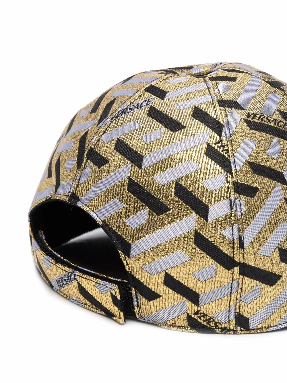 Imprimé graphique intégral, tissage métallisé, fermeture scratch à l’arrière, bord incurvé. Matière : coton.