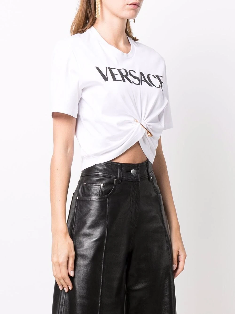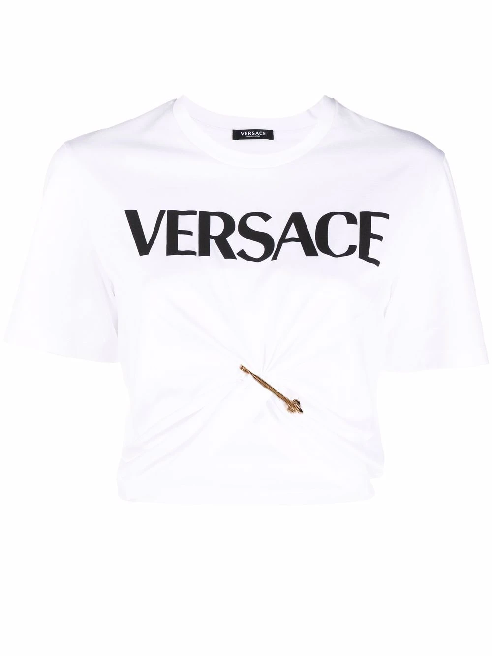 Tricot point jersey, détail d’épingle Medusa signature, logo imprimé à la poitrine, encolure ras du cou, manches courtes. Matière : coton.