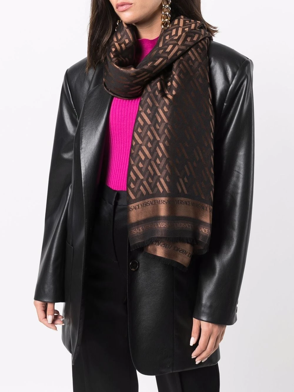 Jacquard à motifs, finitions à logo, bords frangés, maille fine.