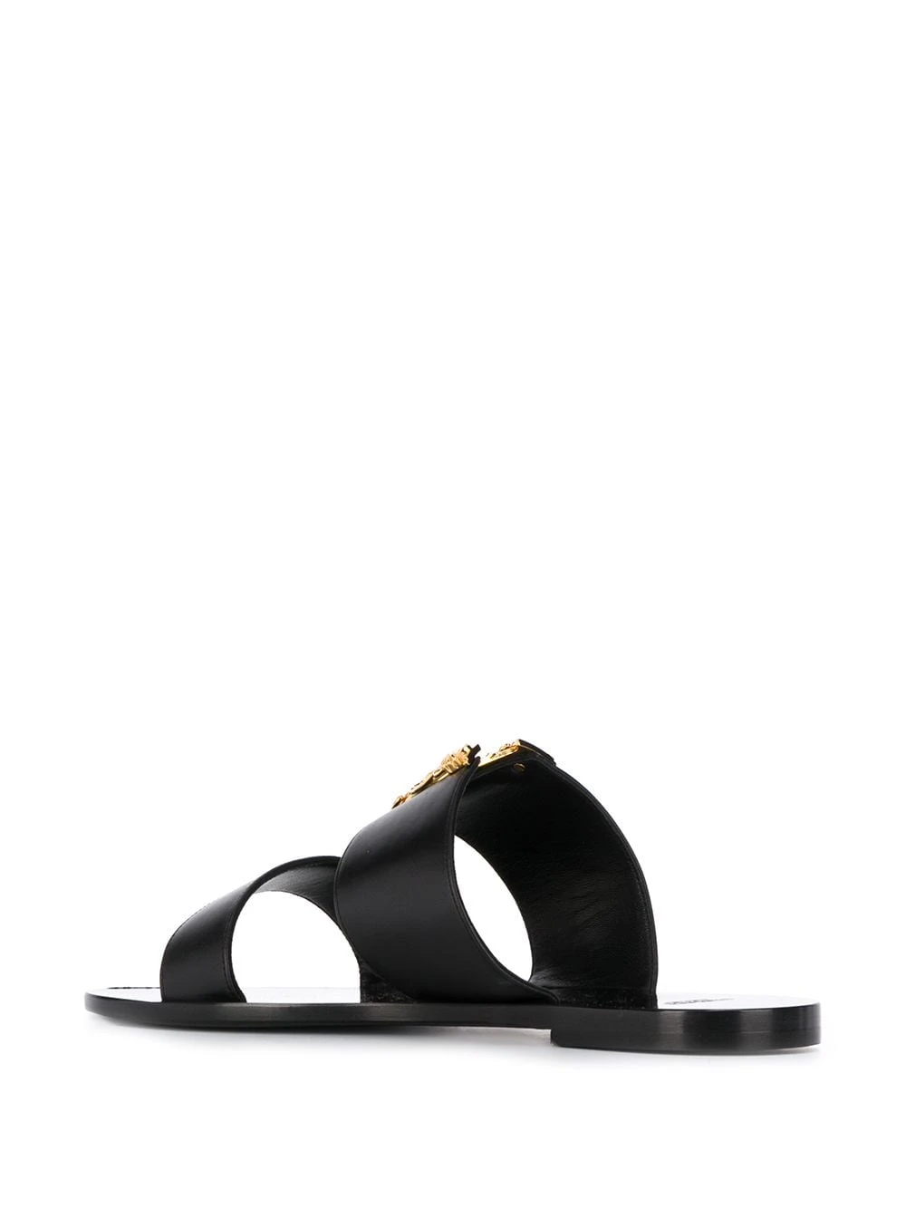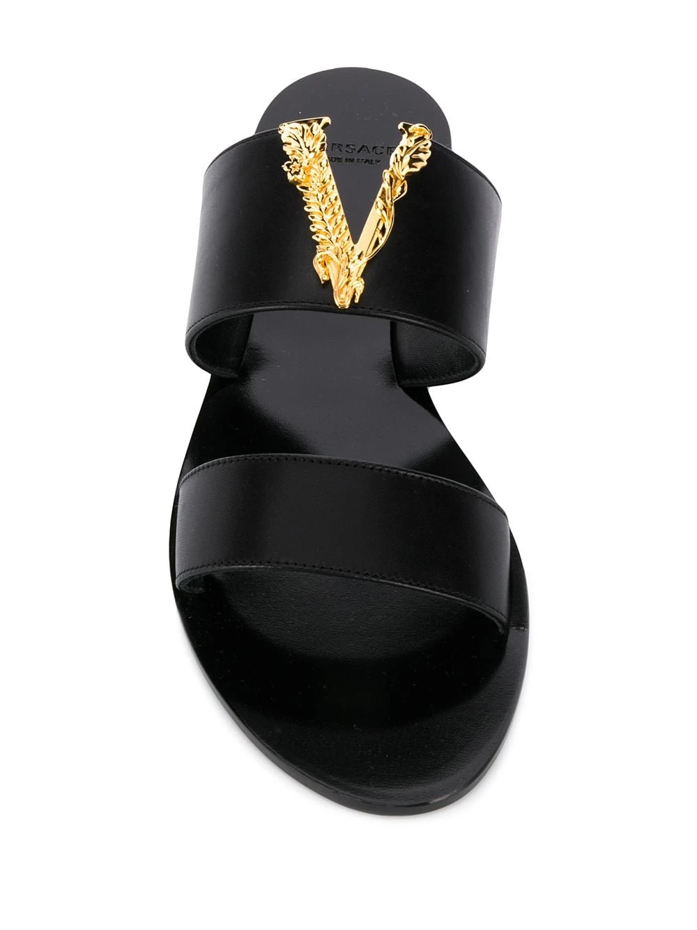 Sandales Virtus Versace avec bout ouvert, design à enfiler, plaque logo dorée, semelle intérieure à logo et semelle plate.