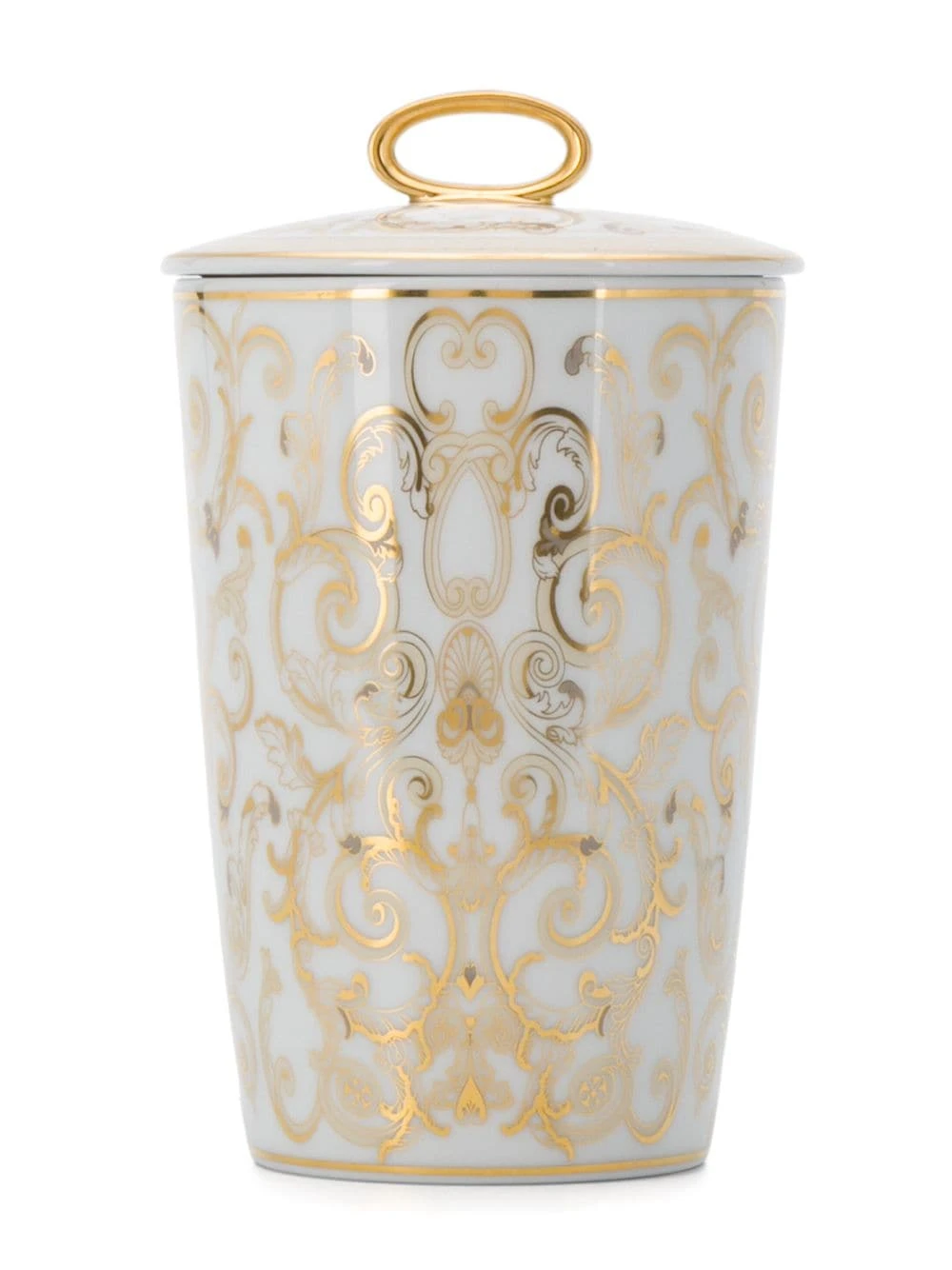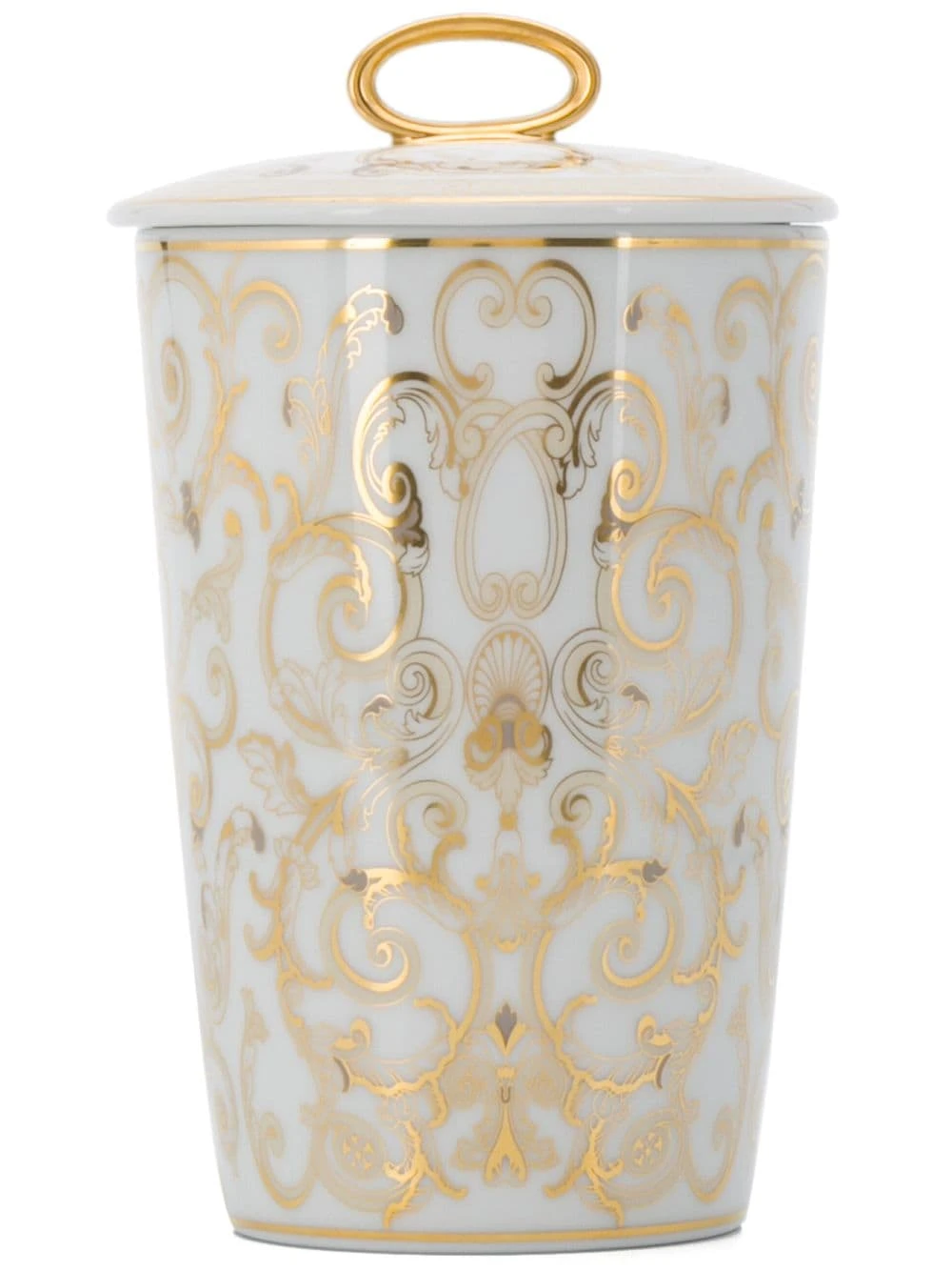 Bougie parfumée Baroque en cire Versace Home avec anse arrondie et motif baroque.