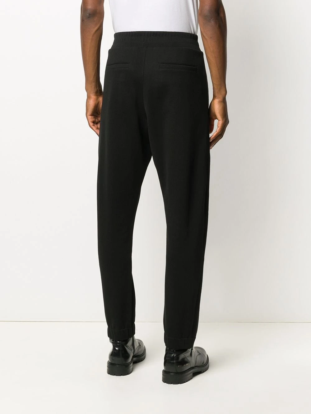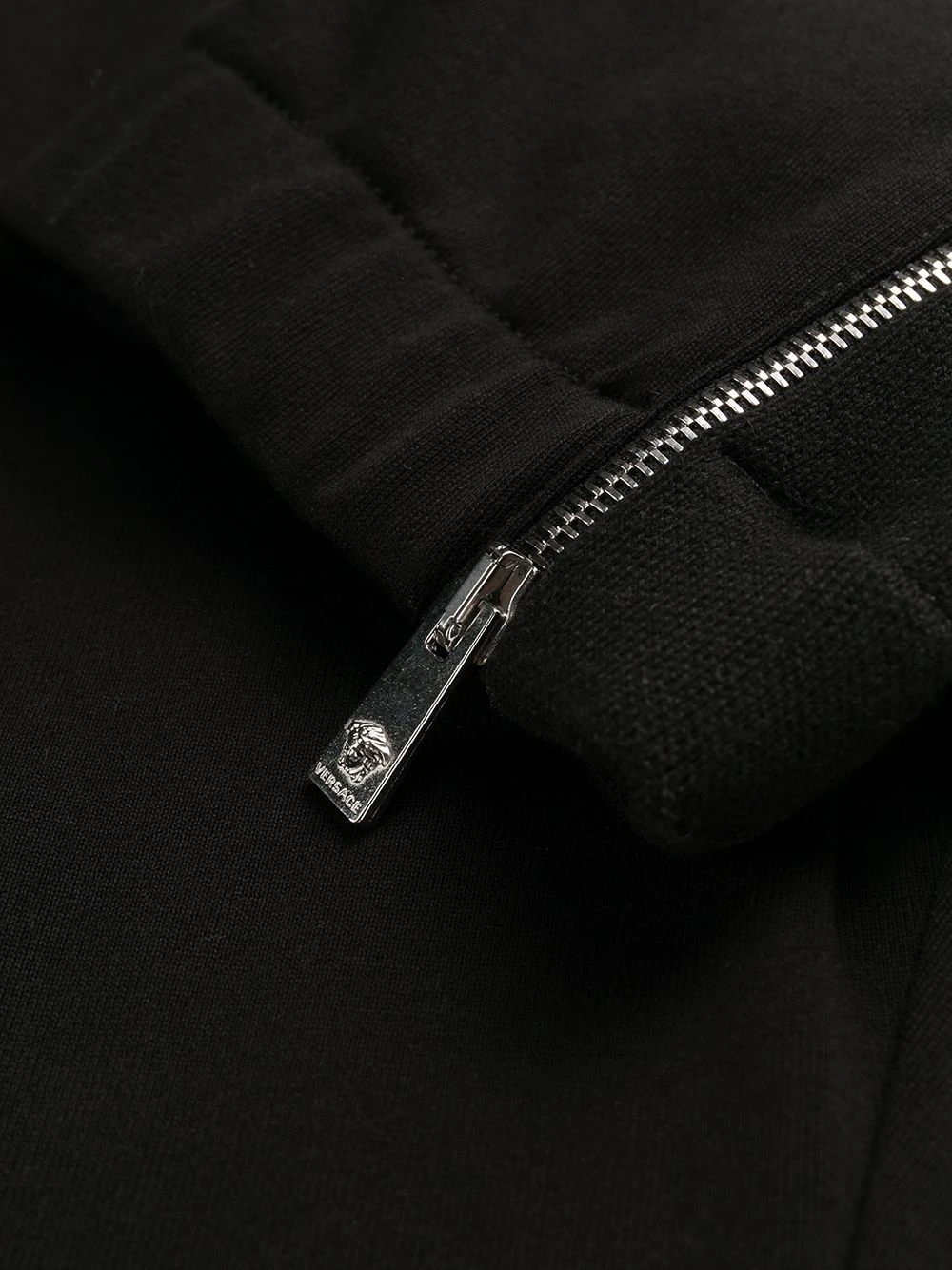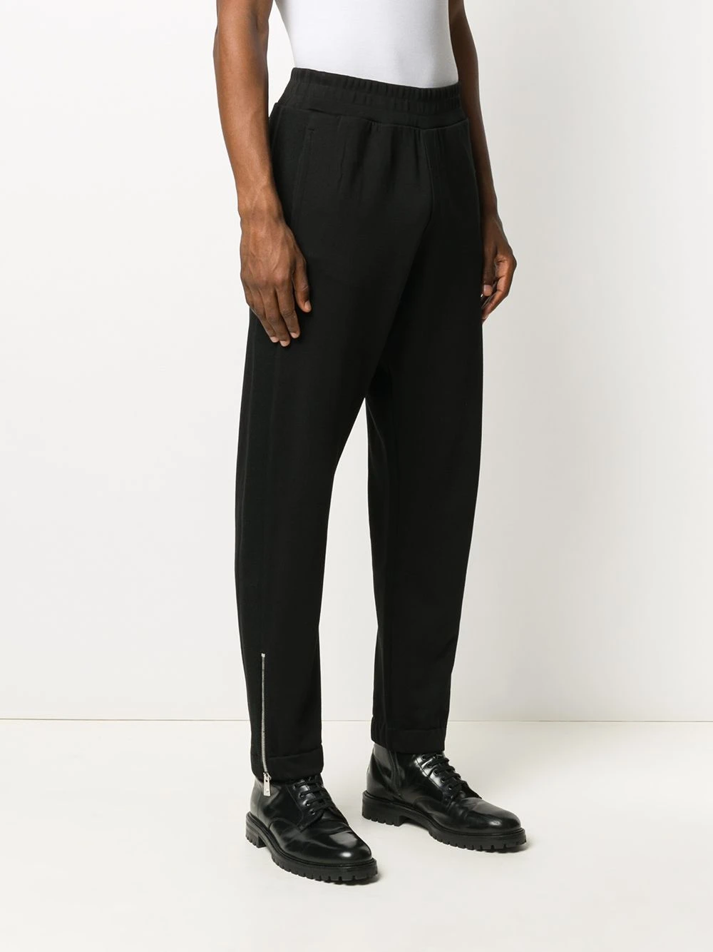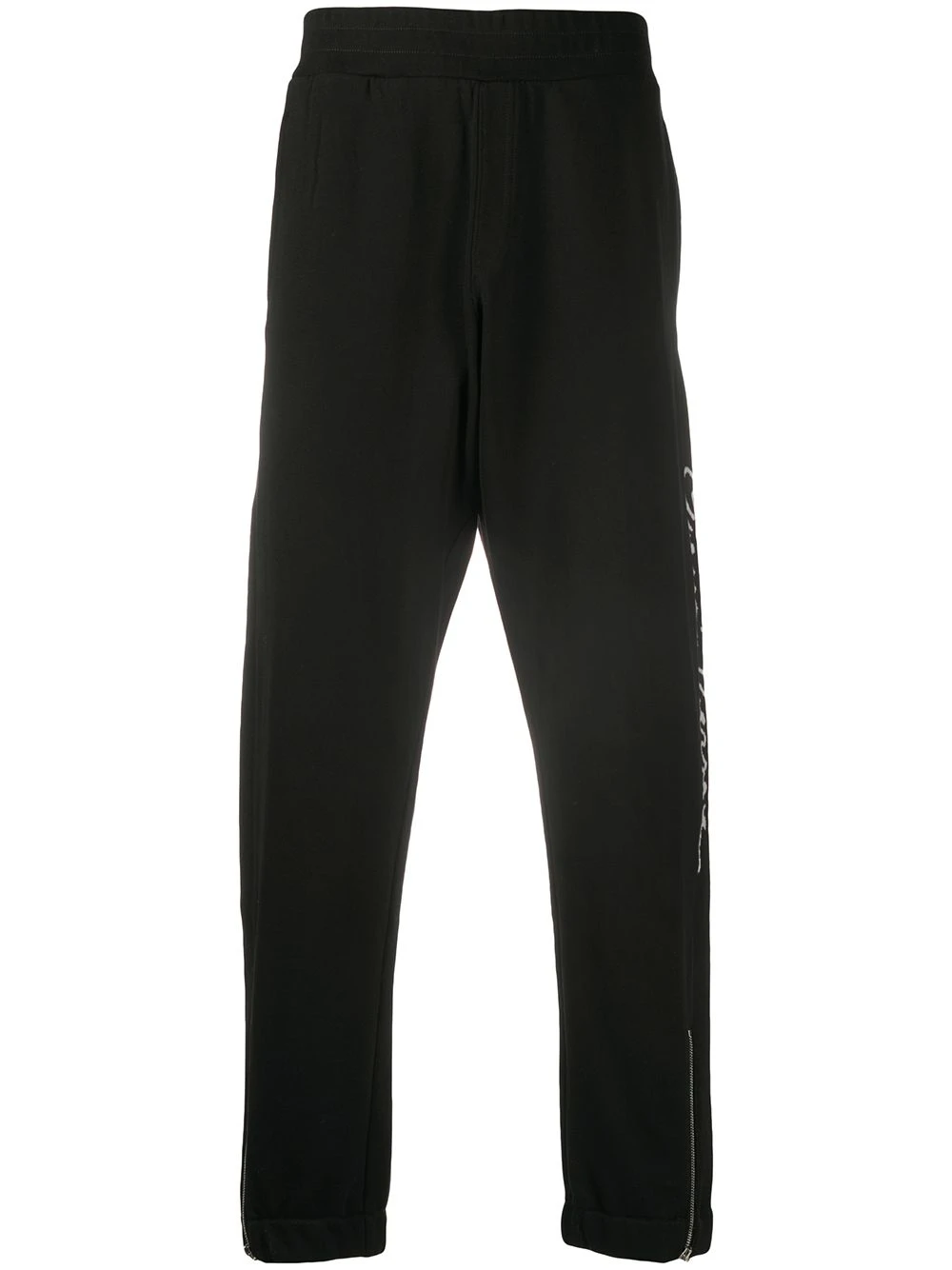 Logo brodé, chevilles zippées, ceinture élastique, coupe droite, deux poches latérales passepoilées, poches arrière passepoilées. Couleur : noir. Matière : coton.