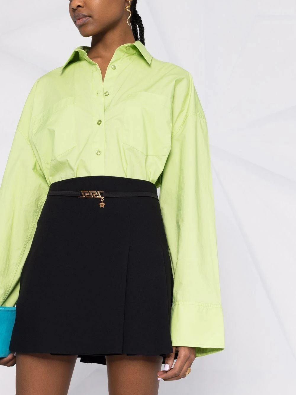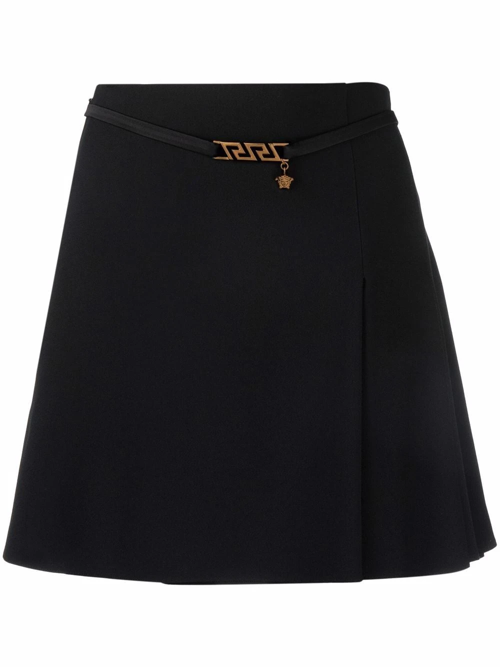 Imprimé La Greca signature, finitions en métal doré, coupe trapèze, taille haute, détails de plis, ourlet incurvé, longueur au dessus du genou. Couleur : noir.