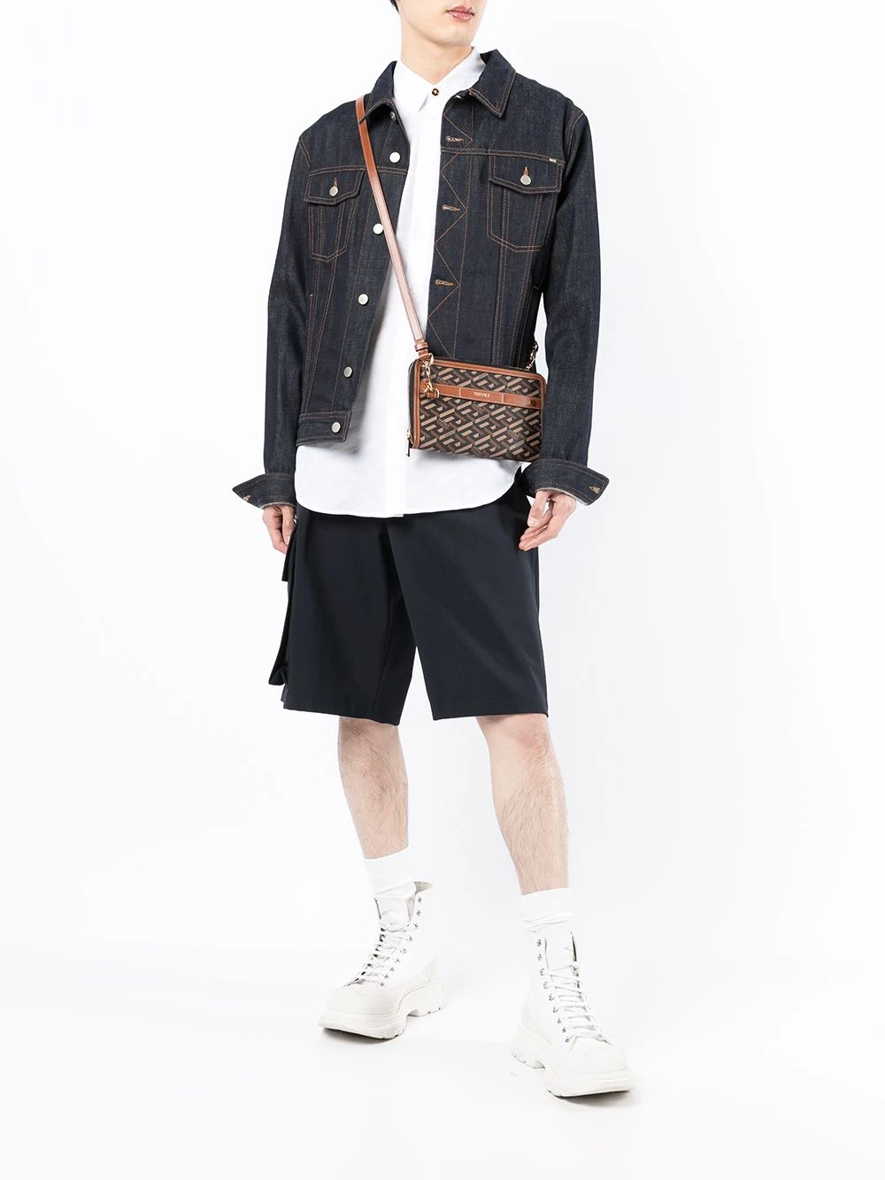 Imprimé monogrammé, fermeture zippée sur le dessus, fentes pour carte, bride porté épaule détachable et ajustable. Couleur : marron. Matière : cuir.