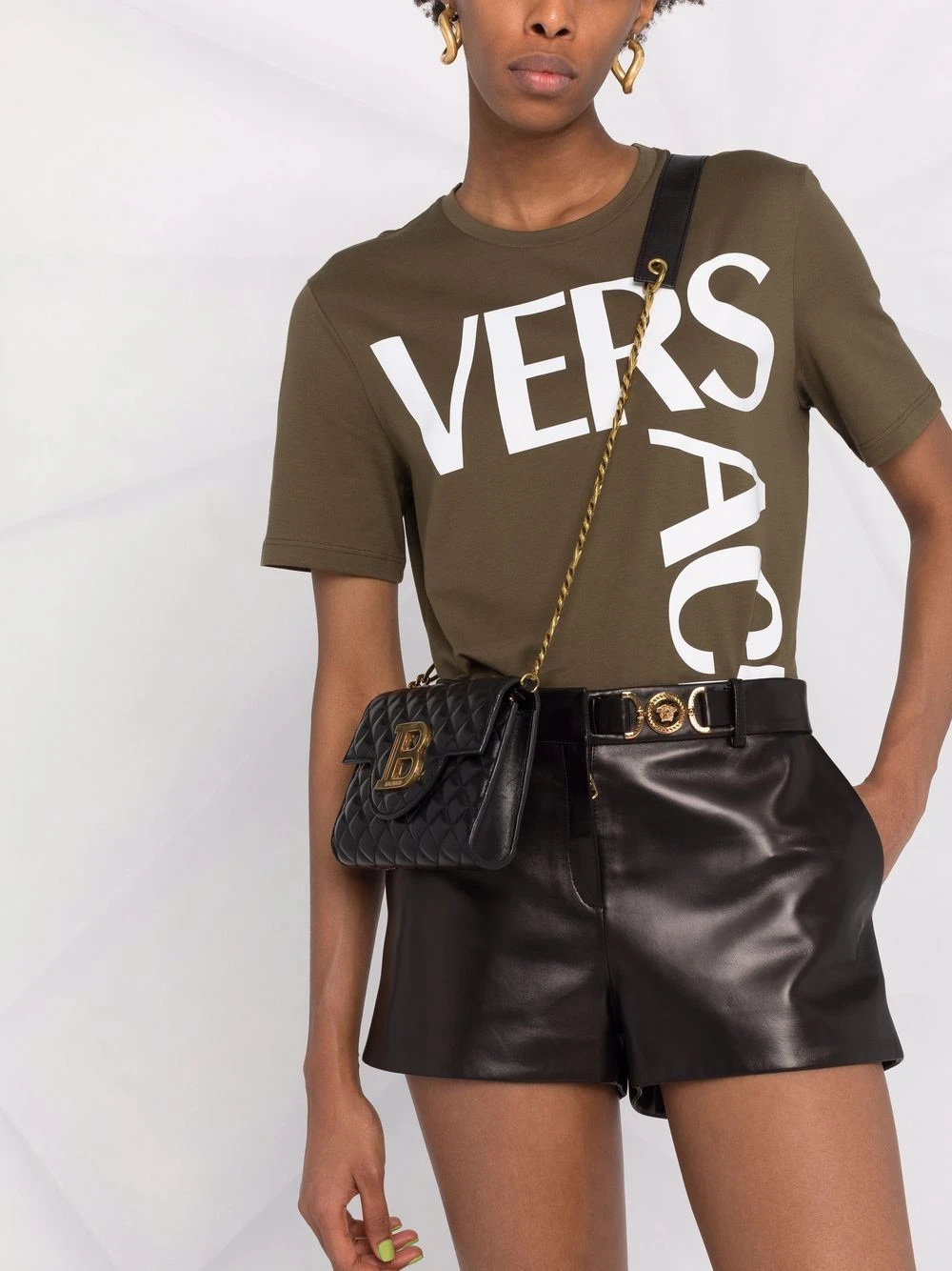 Détail Medusa, finitions en métal doré, taille haute, fermeture dissimulée sur le devant, deux poches latérales fendues. Couleur : noir. Matière : cuir.