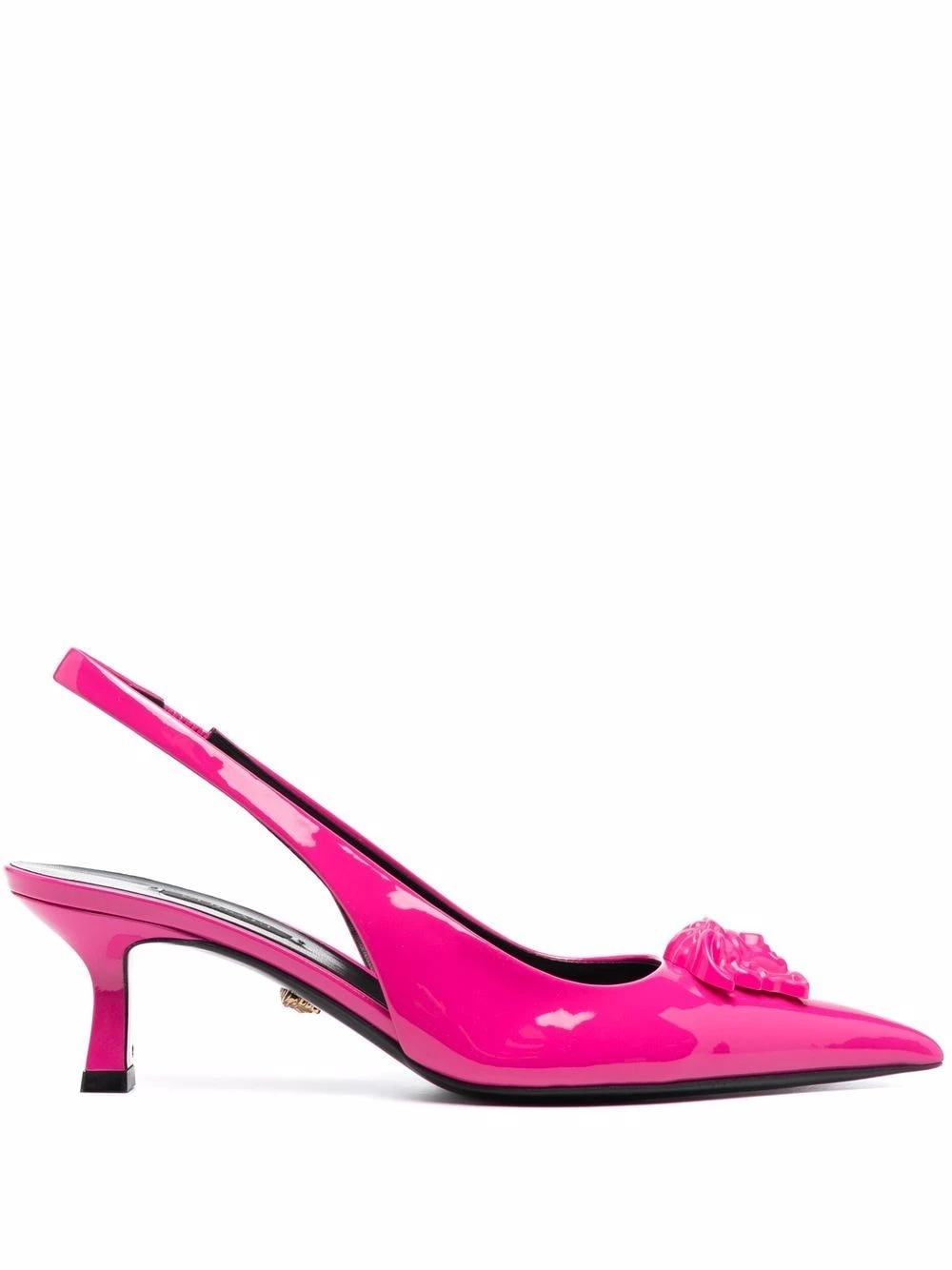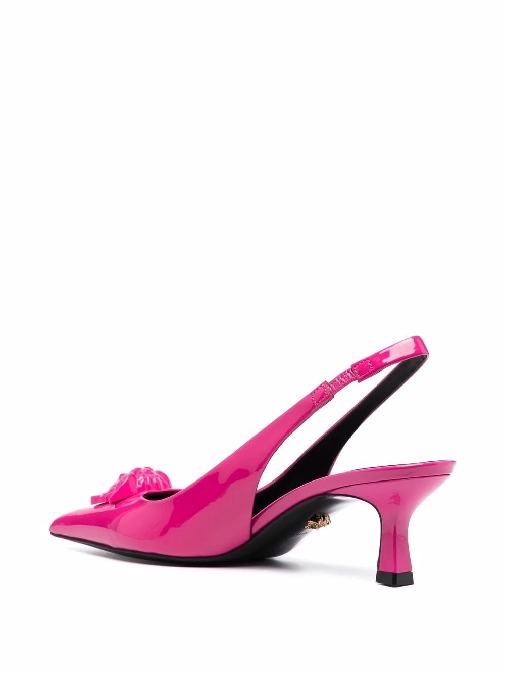 Détail Medusa, bout pointu, semelle intérieure à logo, bride arrière élastique, coutures ton sur ton, talon mi-haut. Matière : cuir.