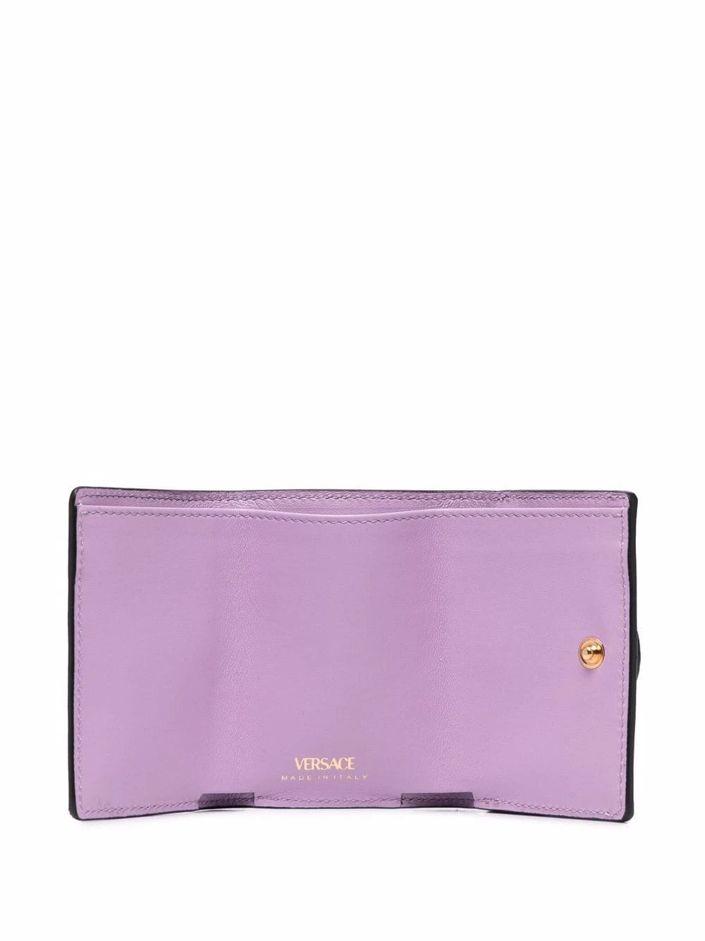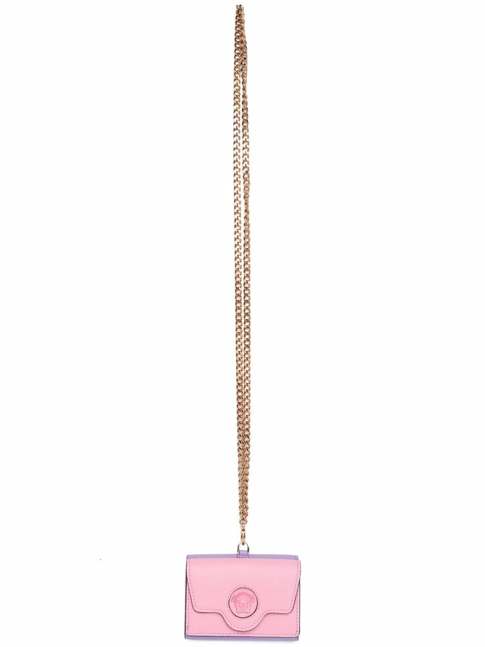 Motif Medusa, logo doré, lanière autour du cou à maillons, finitions en métal doré, design pliable, compartiment à billets intérieur. Matière : cuir.