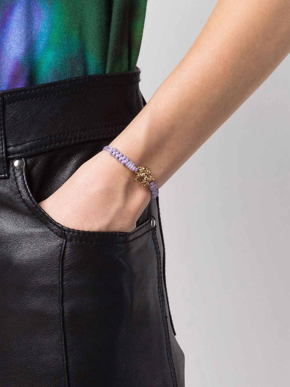 Détail Medusa, lanière tressée, finitions en métal doré.