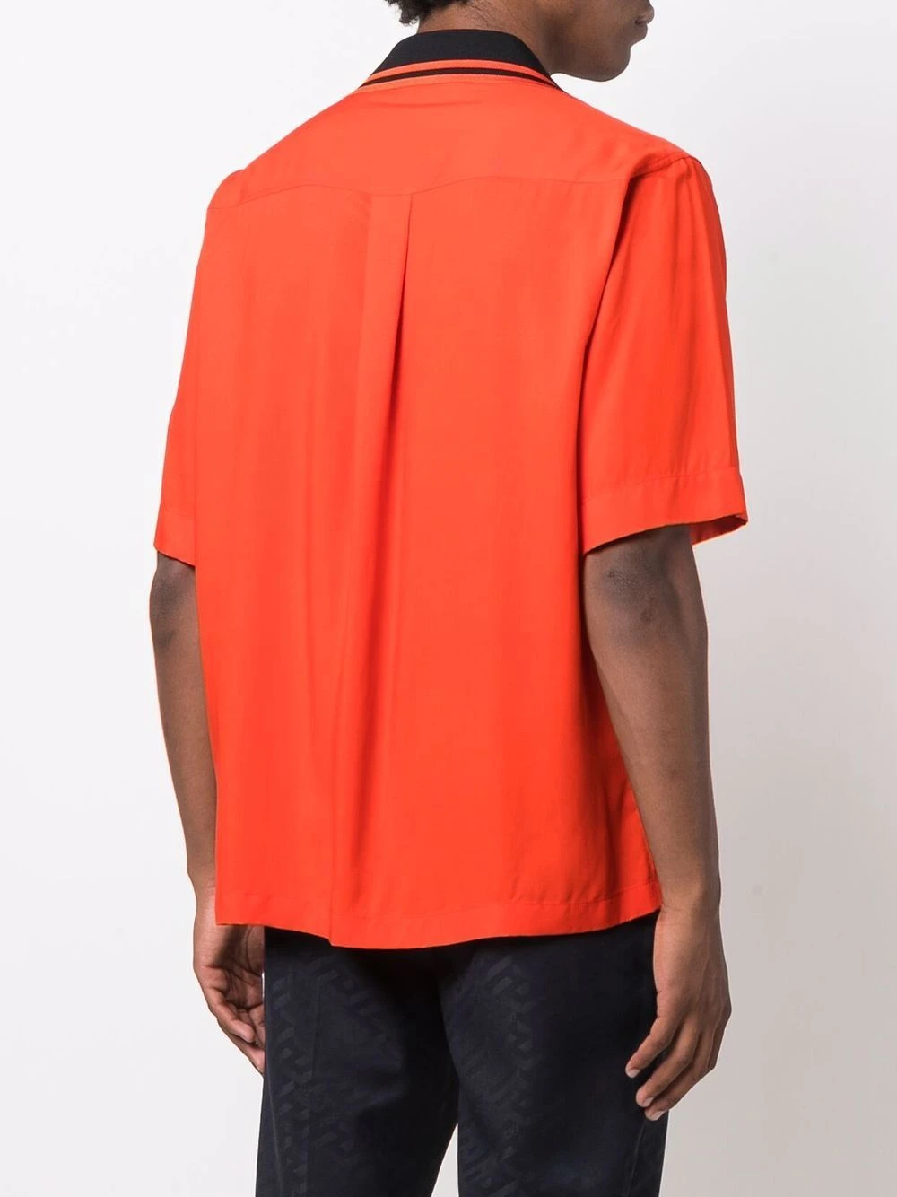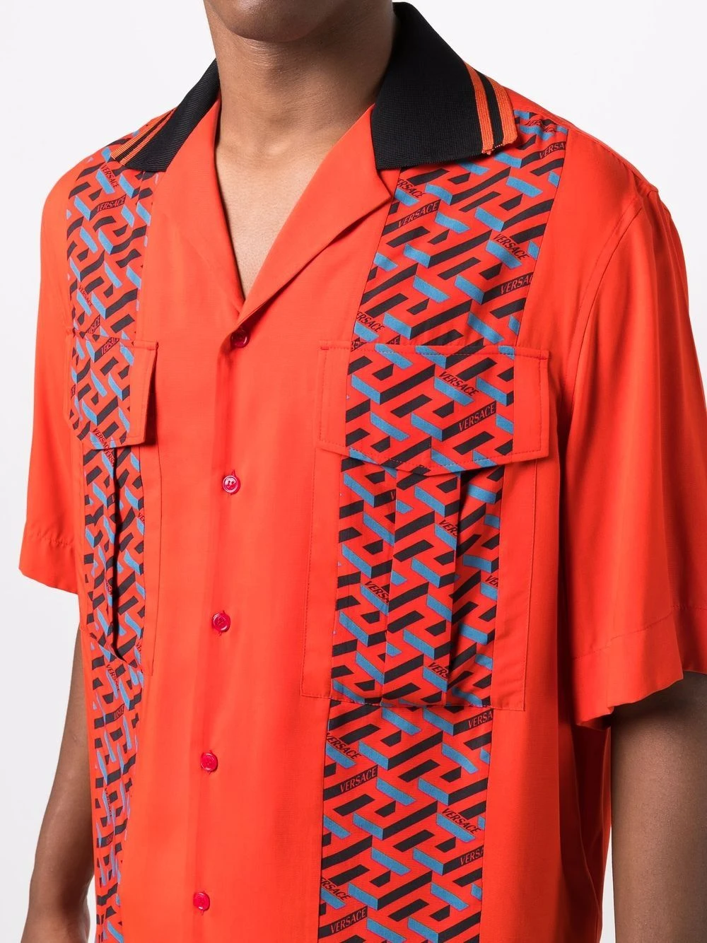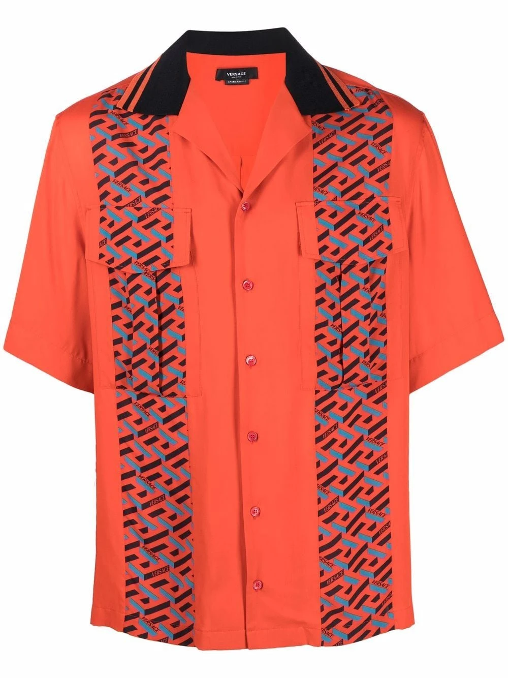 Imprimé monogrammé, col italien, boutonnière sur le devant, manches courtes, deux poches poitrine à rabat. Couleur : orange.