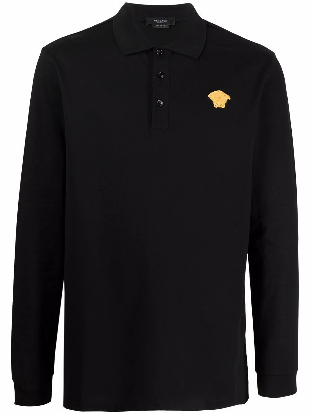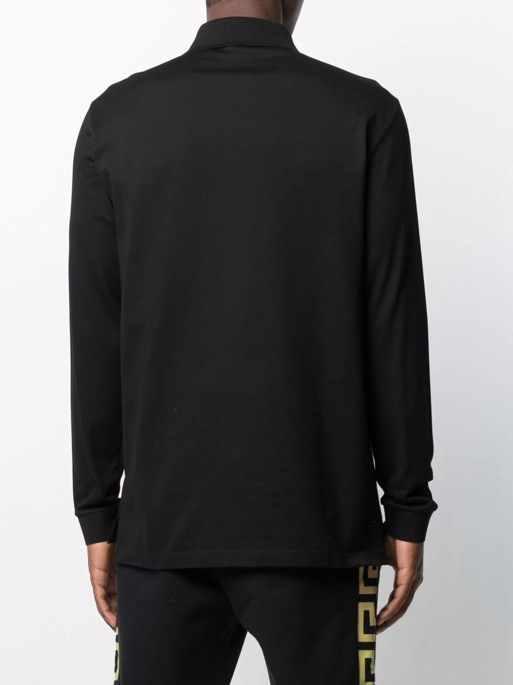 Col polo, patte de boutonnage sur le devant, manches longues, poignets nervurés, ourlet plus long au dos. Couleur : noir. Matière : coton.