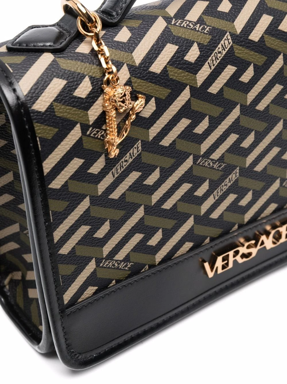 Imprimé La Greca signature, breloque à logo, logo doré, rabat sur le dessus à fermeture magnétique, anse arrondie, bride porté épaule détachable et ajustable. Couleur : vert. Matière : cuir de veau.