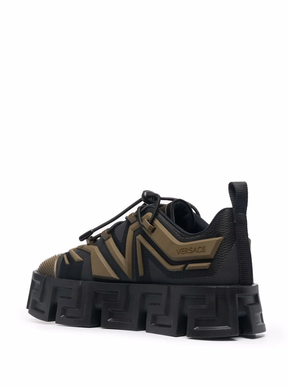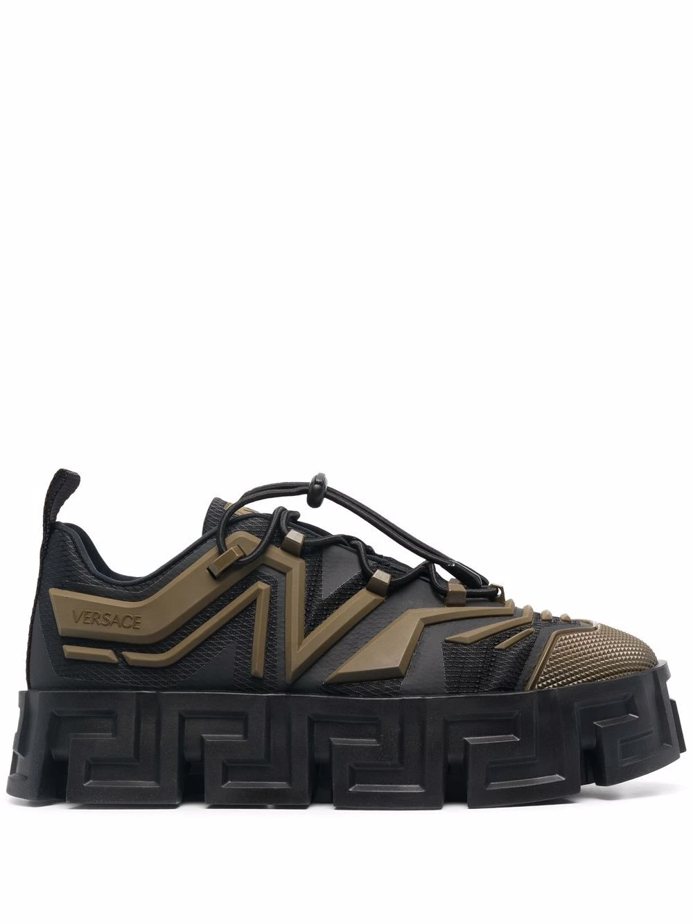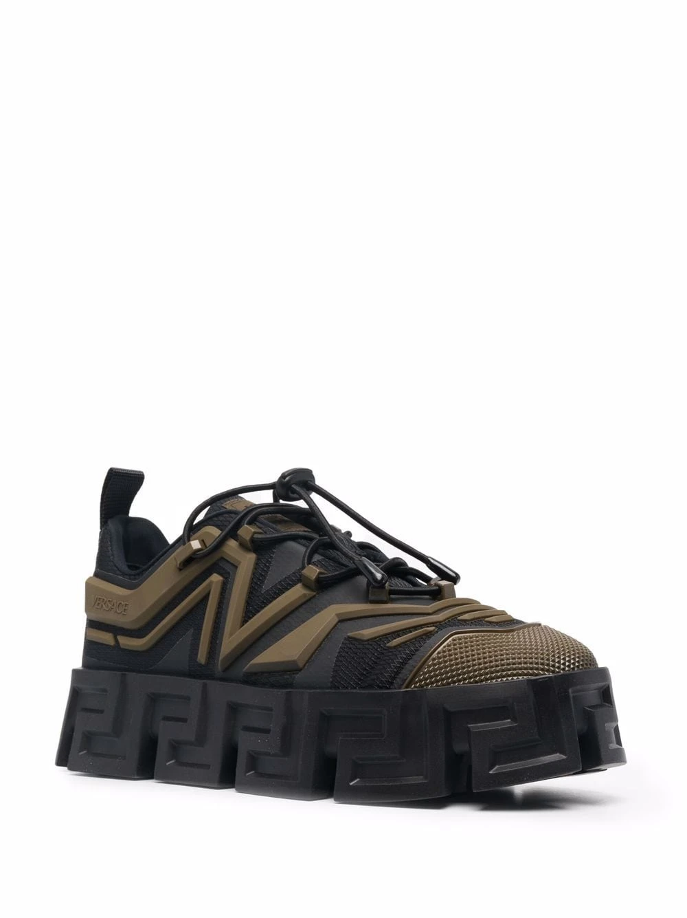 Languette d’enfilage au talon, fermeture à lacer sur le devant, bout rond, détail Greca signature. Couleur : noir. Matière : cuir.