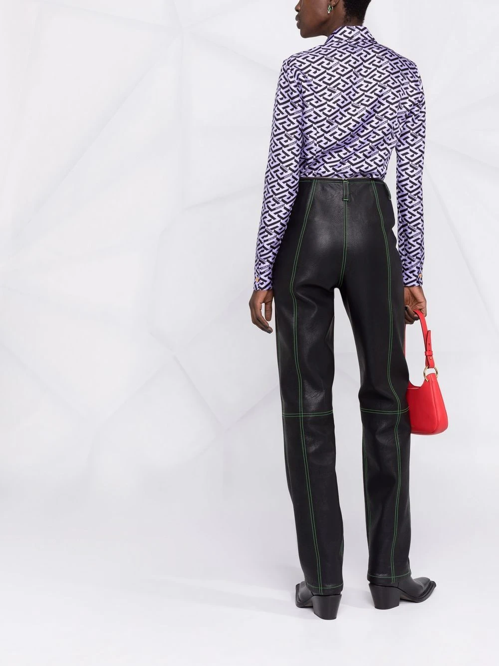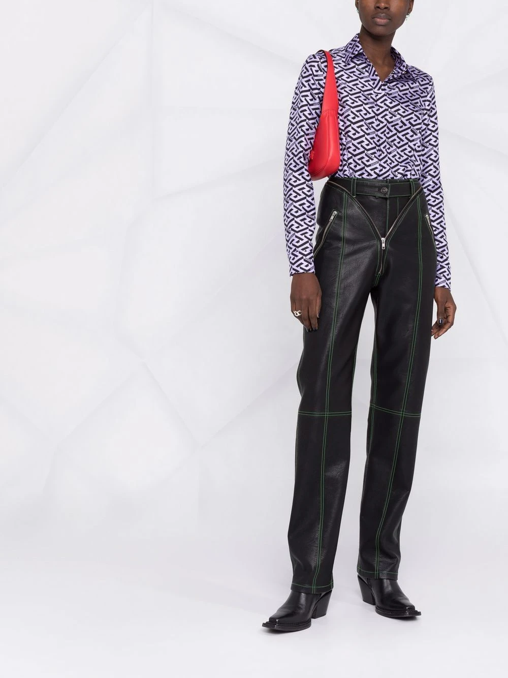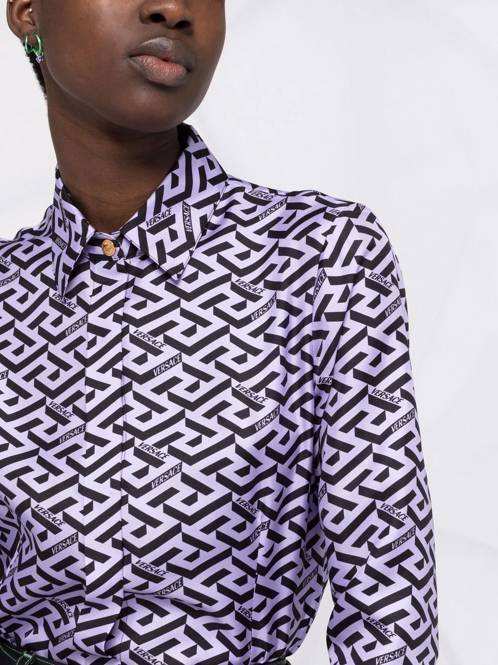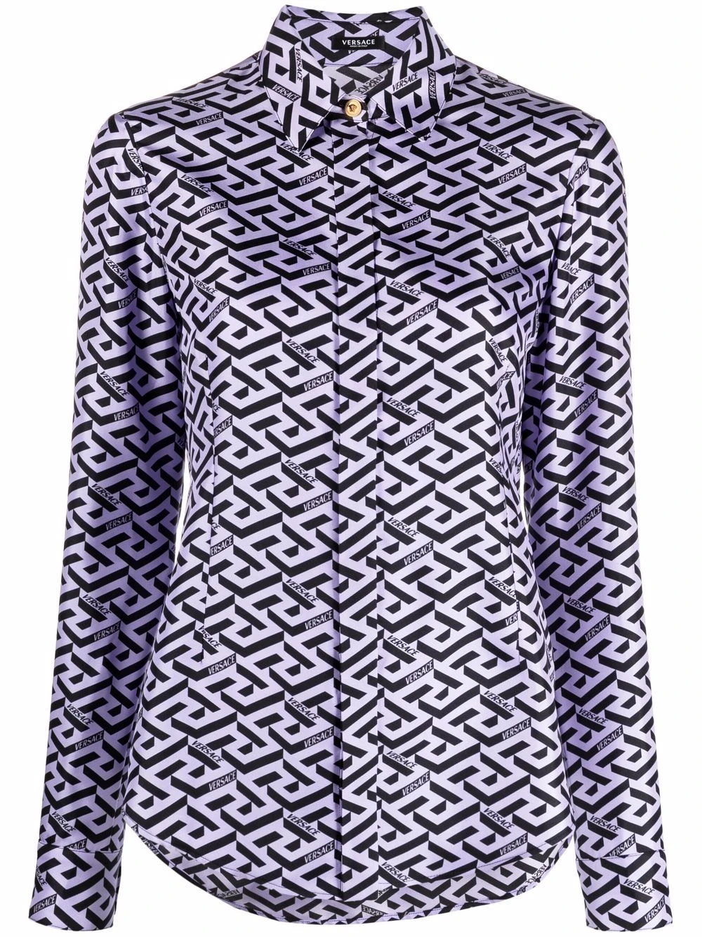 Imprimé monogrammé, col classique, fermeture dissimulée sur le devant, manches longues. Matière : soie.