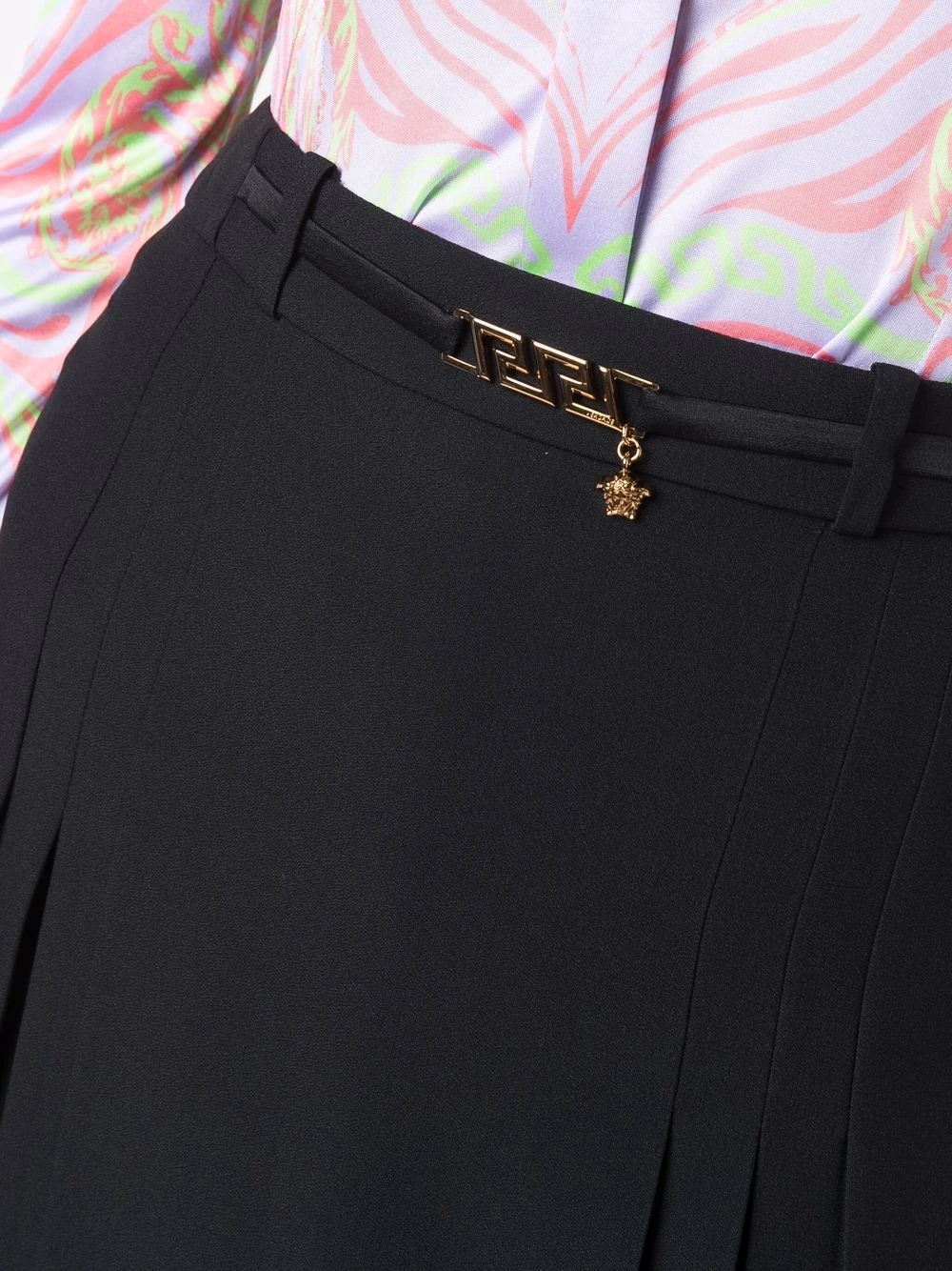 Détail Medusa, motif Greca signature imprimé, finitions en métal doré, taille haute, détails de plis. Couleur : noir. Matière : soie.