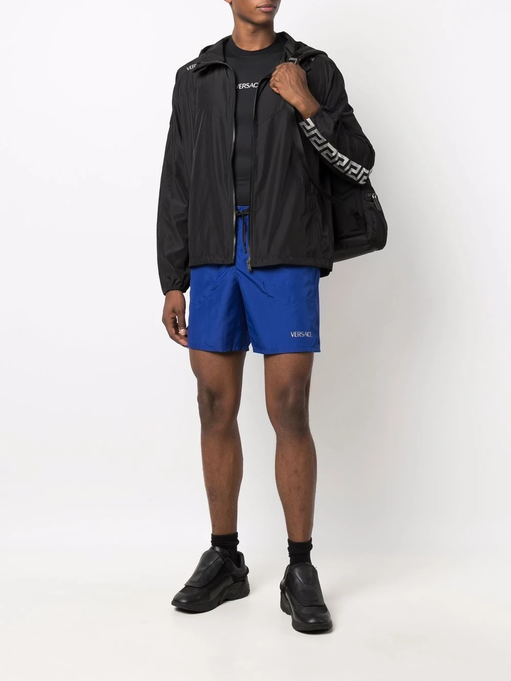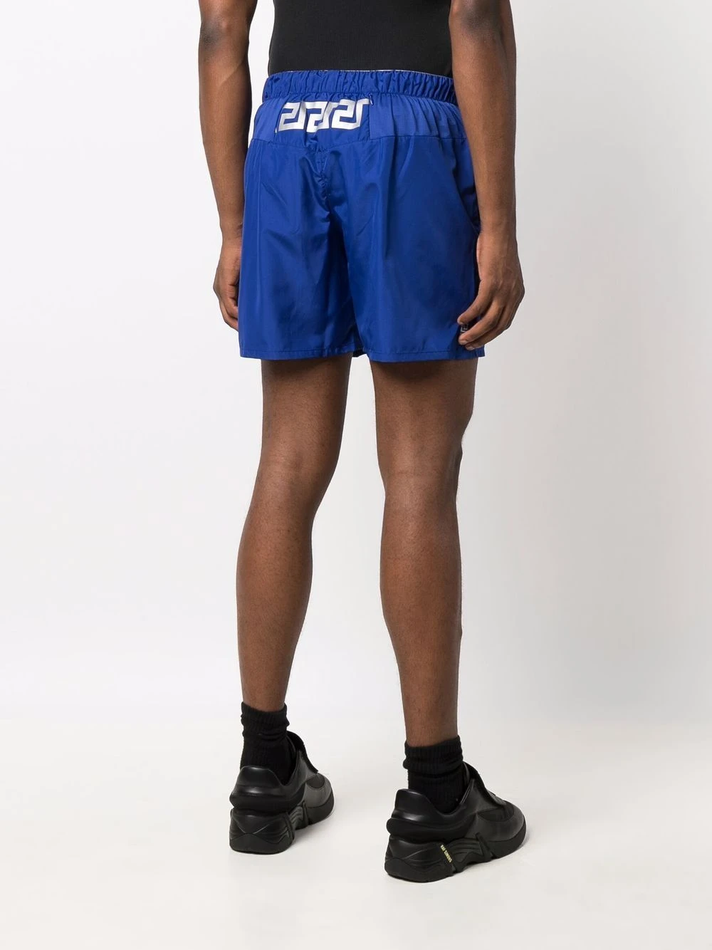 Détail Greca signature, logo imprimé sur le côté, taille élastique à lien de resserrage, poches latérales fendues.