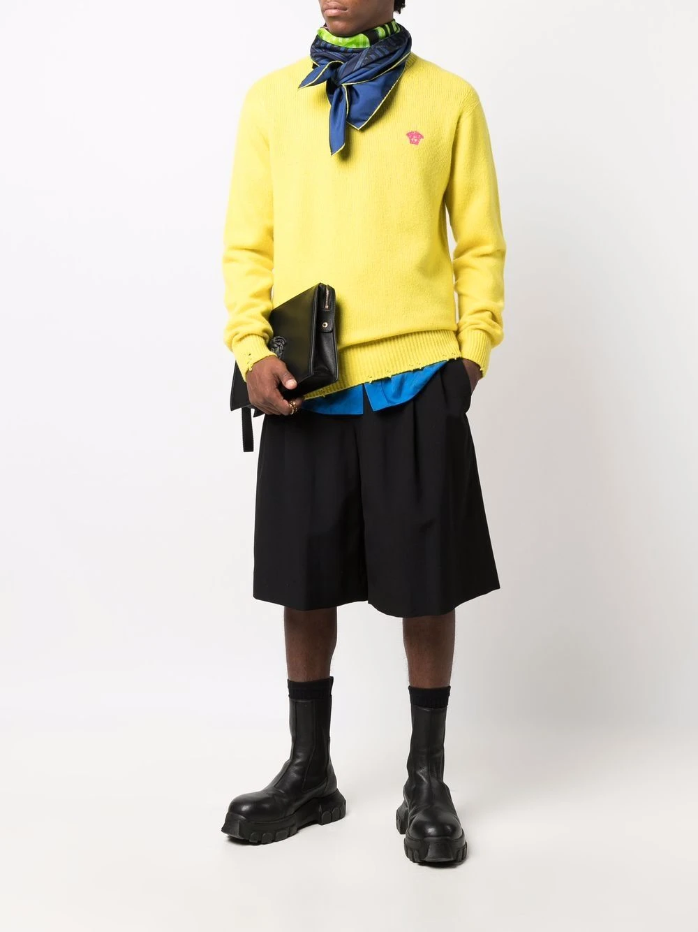 Jaune canari, motif Medusa, finitions effilochées, encolure ras du cou, manches longues, ourlet nervuré.