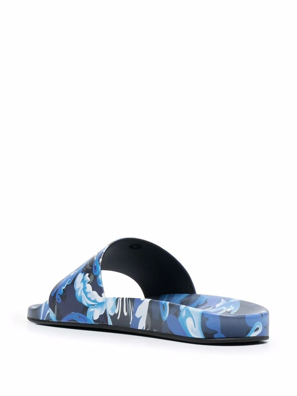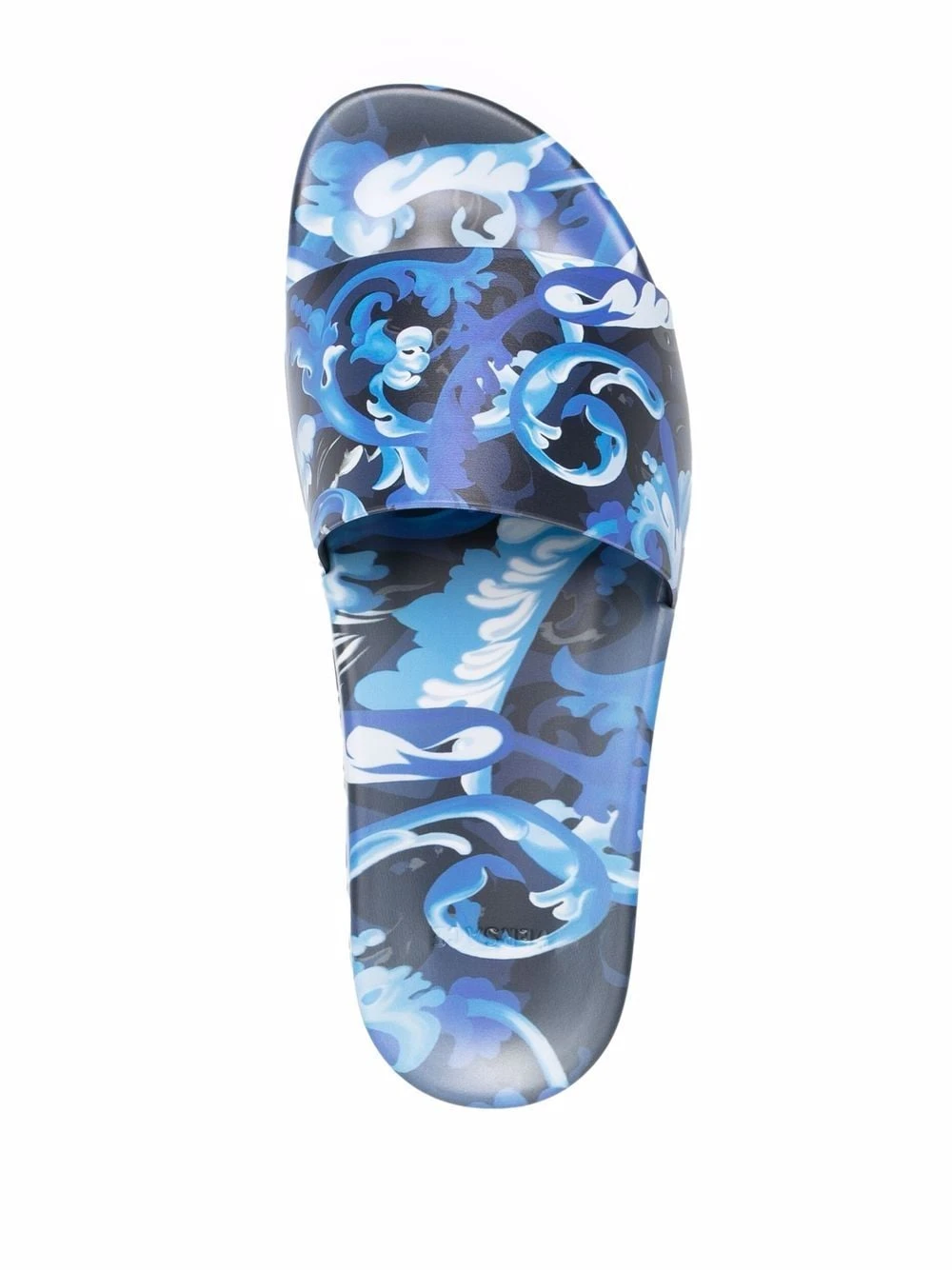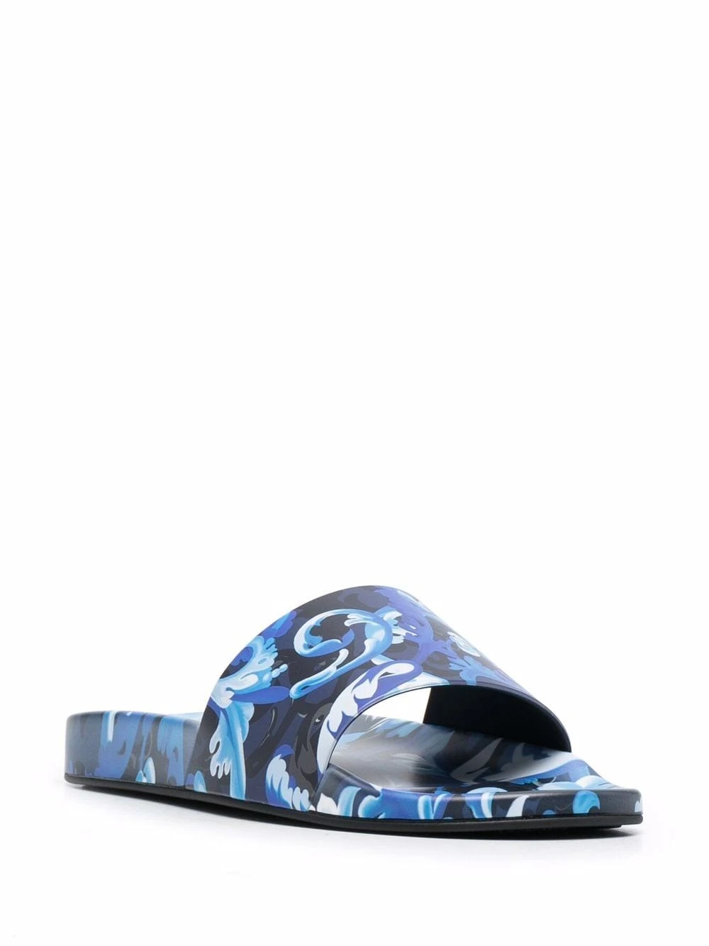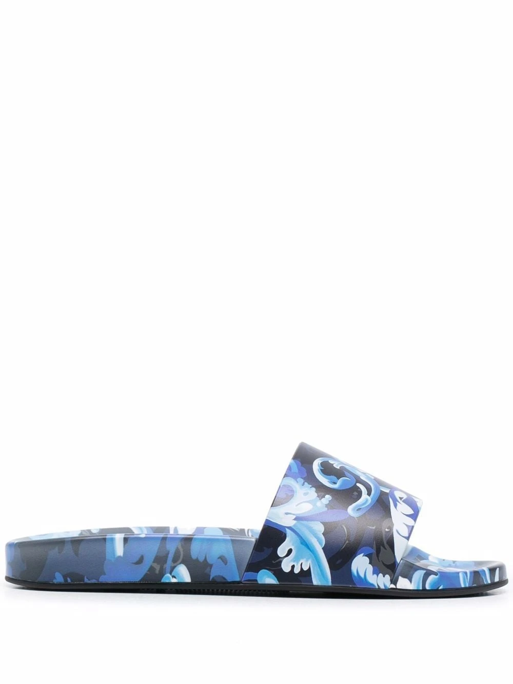 Motif baroque, semelle intérieure à logo, bout ouvert, design à enfiler, semelle plate en caoutchouc.