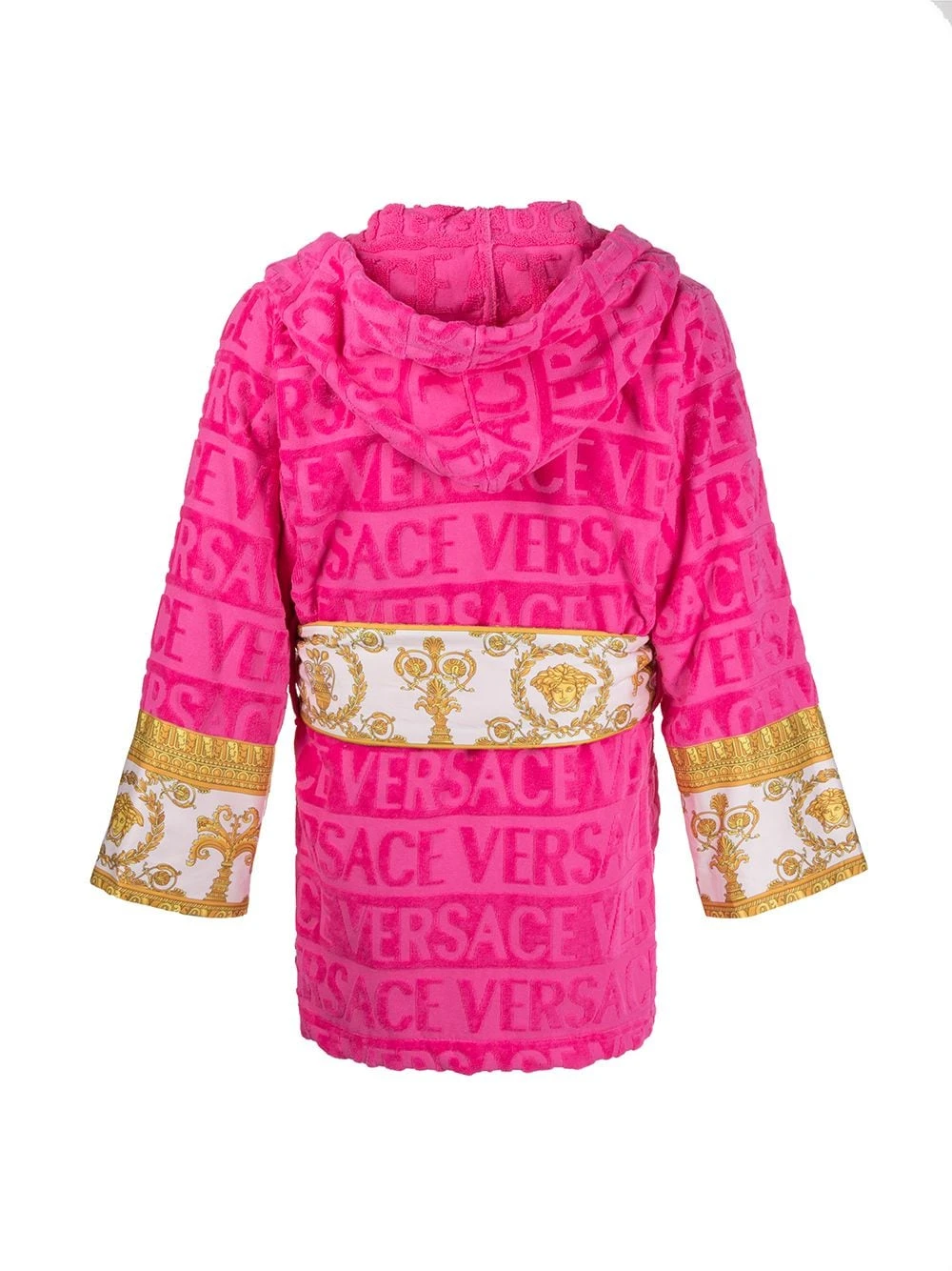 Imprimé monogrammé, imprimé Barocco signature, deux poches plaquées avant, col châle, capuche souple, manches longues, taille nouée. Matière : coton.