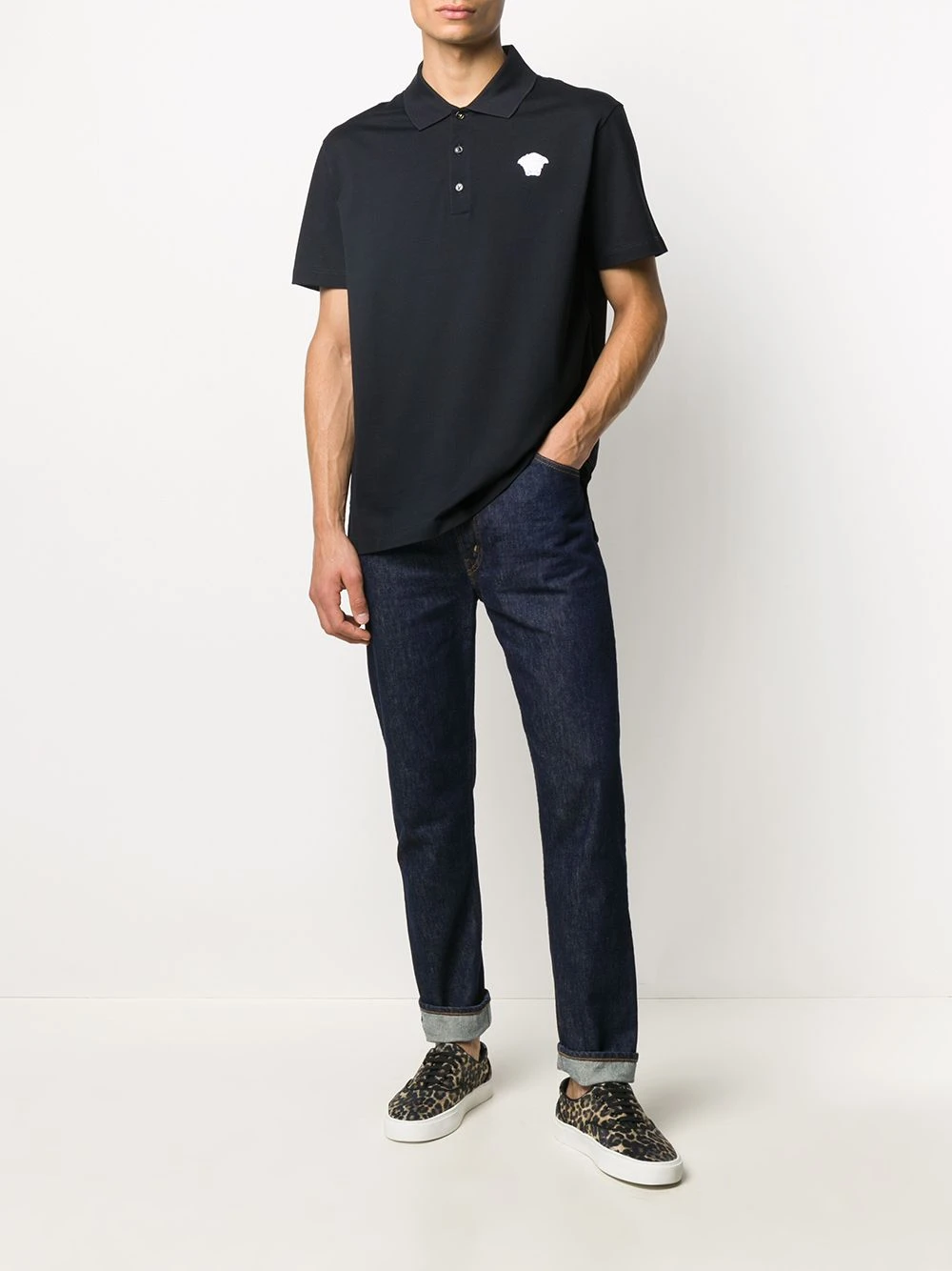 Motif Medusa, col polo, manches courtes, ourlet droit. Matière : coton.