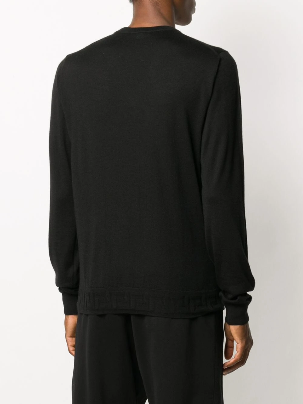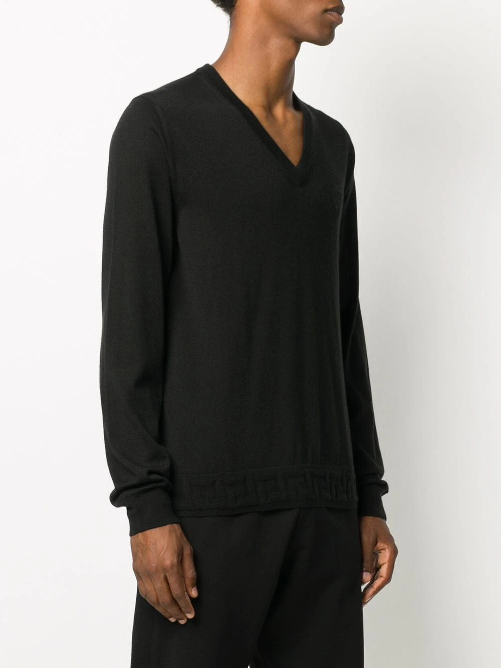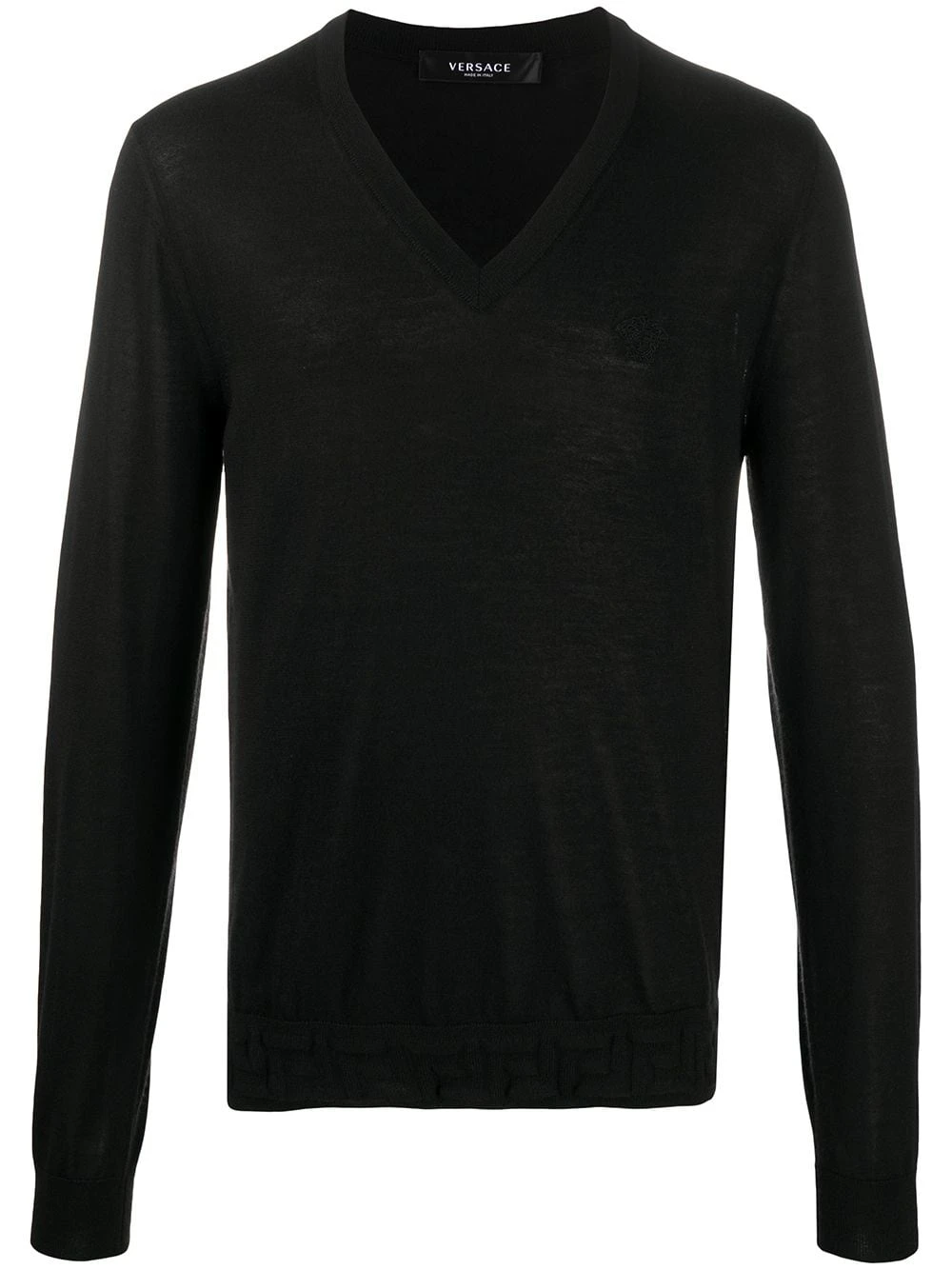 Design tricoté, motif Medusa, col v, manches longues. Couleur : noir. Matière : cachemire.