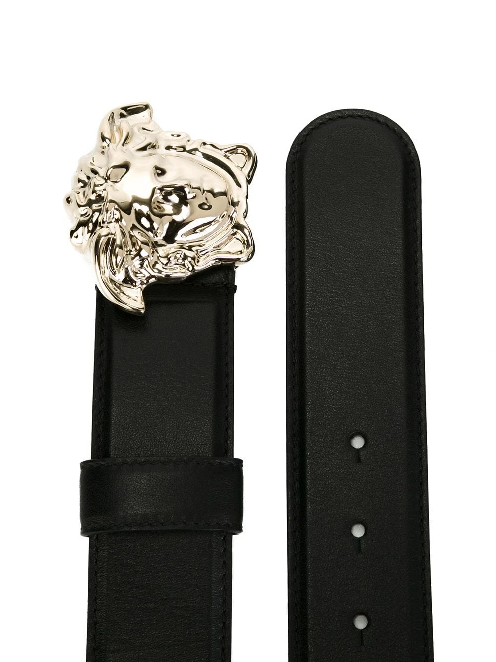 Ceinture à boucle Medusa en cuir noir Versace avec finitions dorées et taille ajustable.