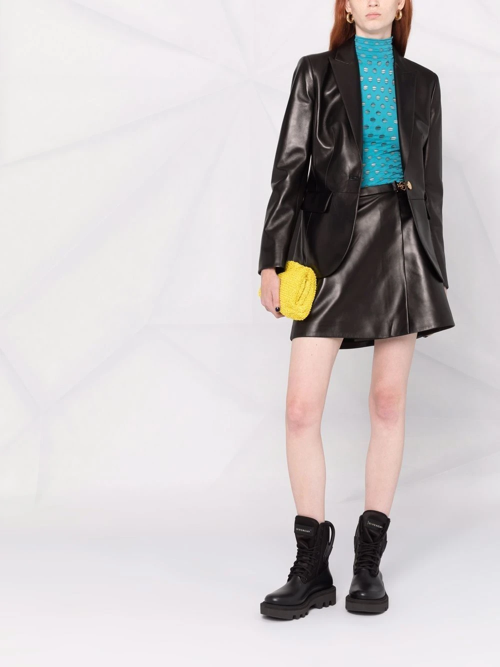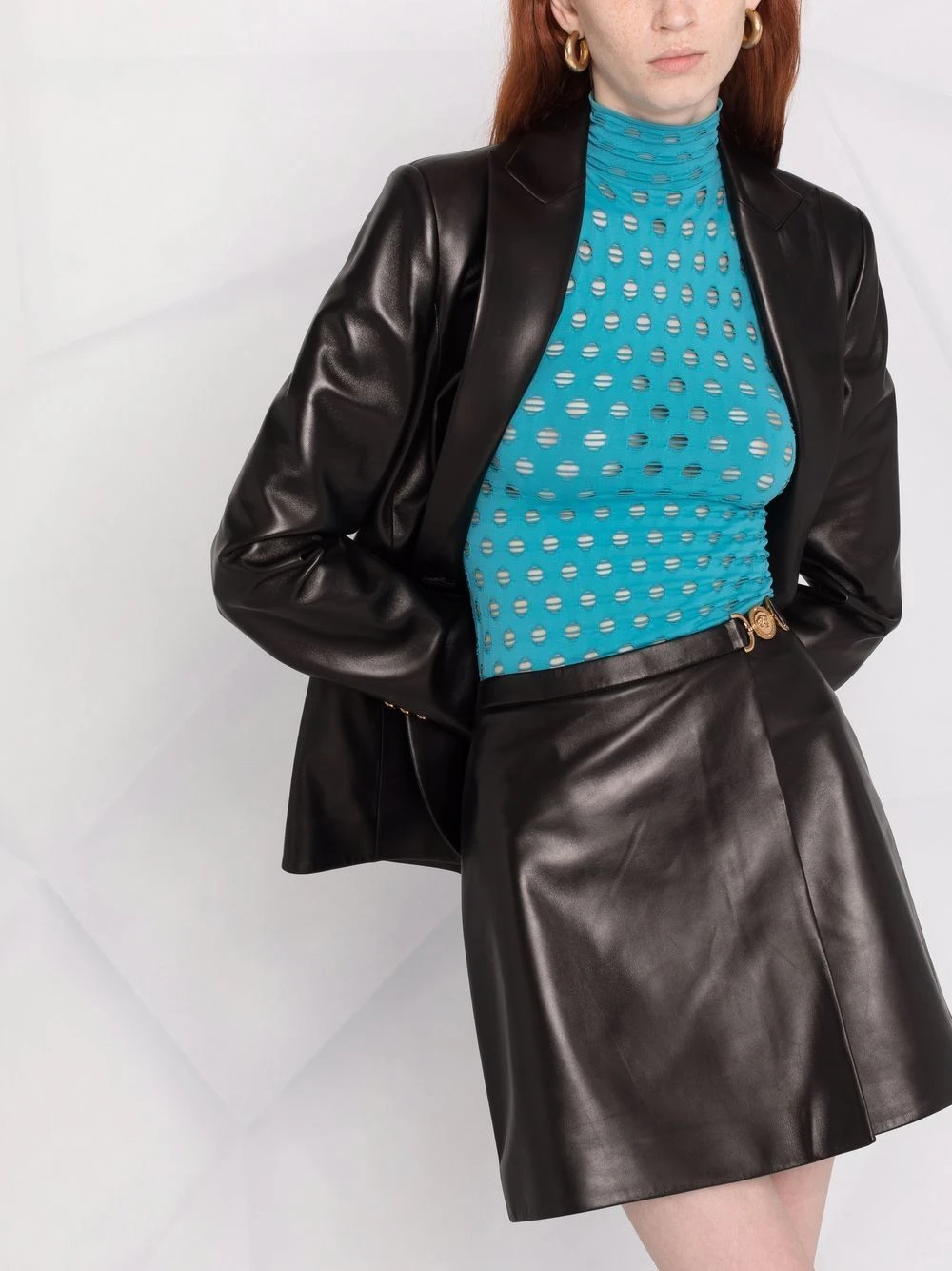Taille haute, détail Medusa, finitions en métal doré, design portefeuille, coutures ton sur ton, ourlet incurvé, longueur au dessus du genou. Couleur : noir.