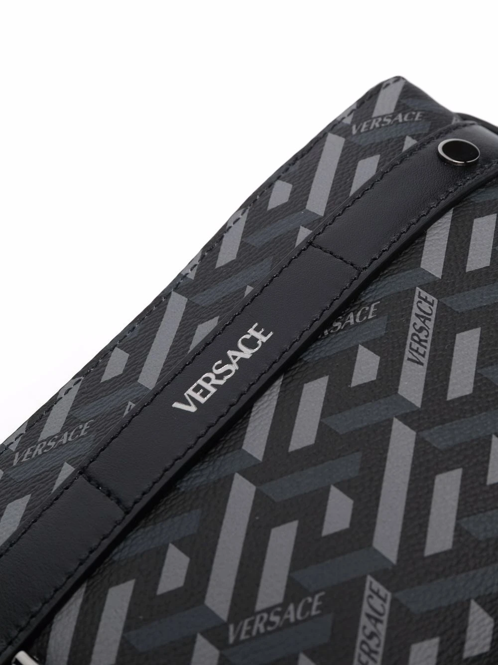 Motif géométrique, plaque logo argentée, fermeture zippée sur le dessus, compartiment principal. Couleur : gris. Matière : cuir.