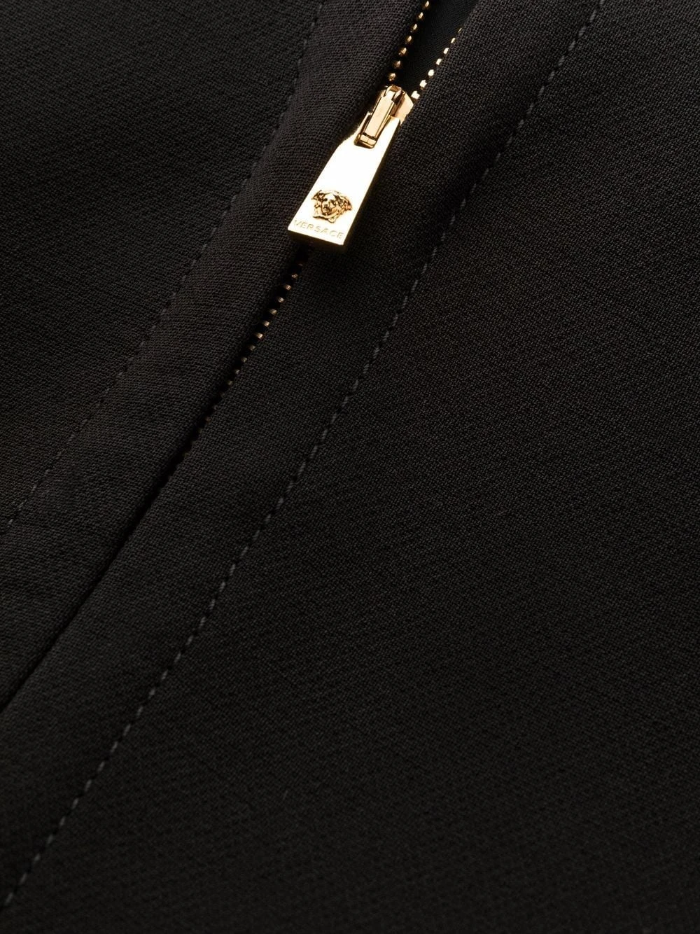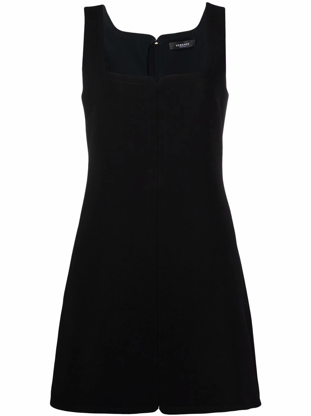 Encolure carrée, détail de fente, design sans manches, coupe évasée, fermeture zippée à l’arrière. Couleur : noir.