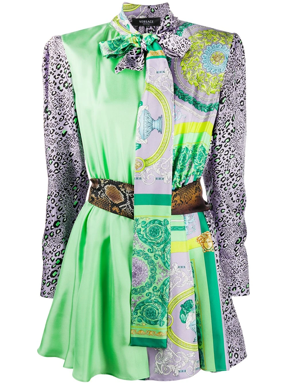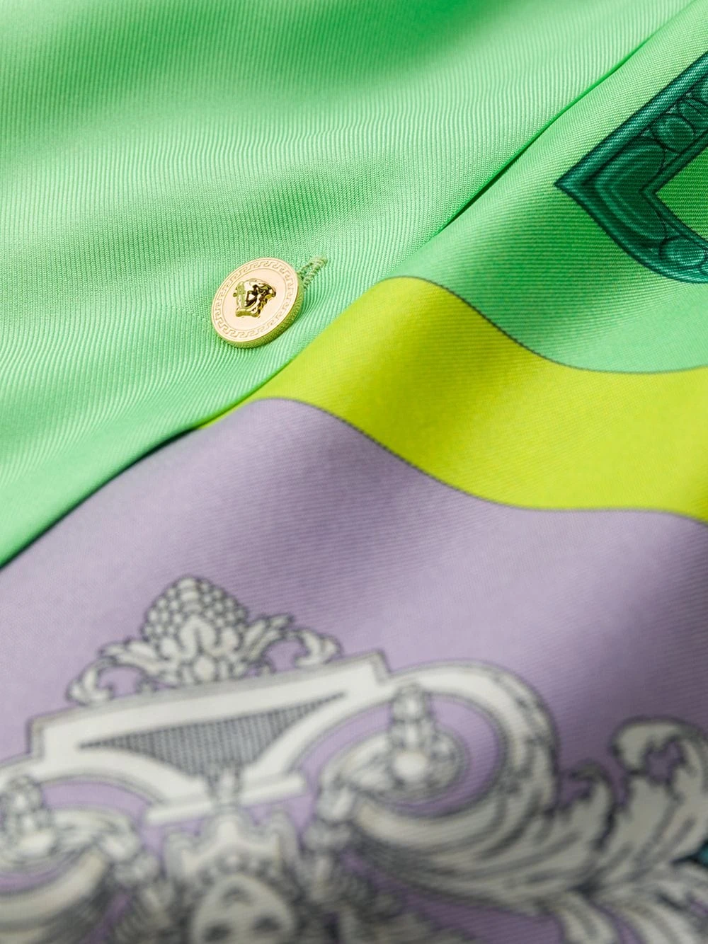 Imprimé Barocco signature, col lavallière à nouer, taille ceinturée, détails de plis, manches longues, poignets boutonnés, épaulettes, fermeture zippée dissimulée à l’arrière. Matière : soie.