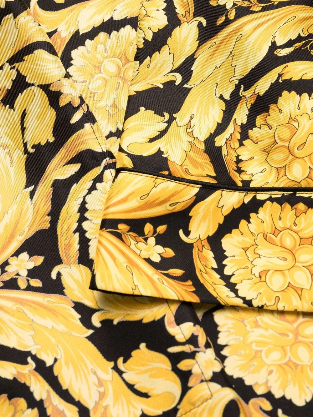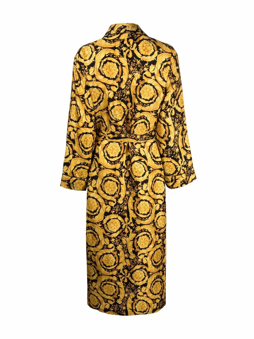 Imprimé Barocco signature, col châle, taille ceinturée, manches longues, ourlet droit, coupe mi-longue. Matière : soie.