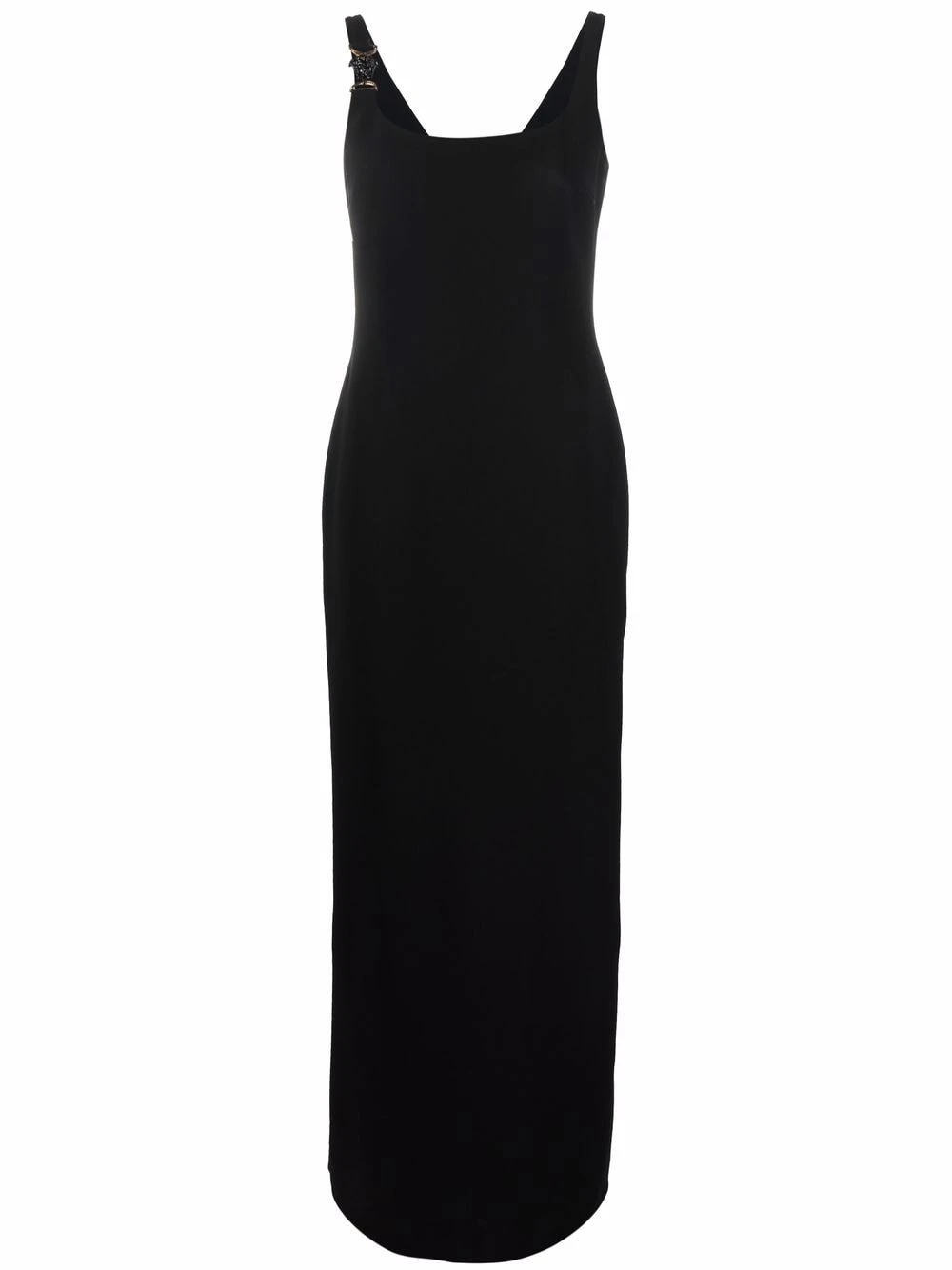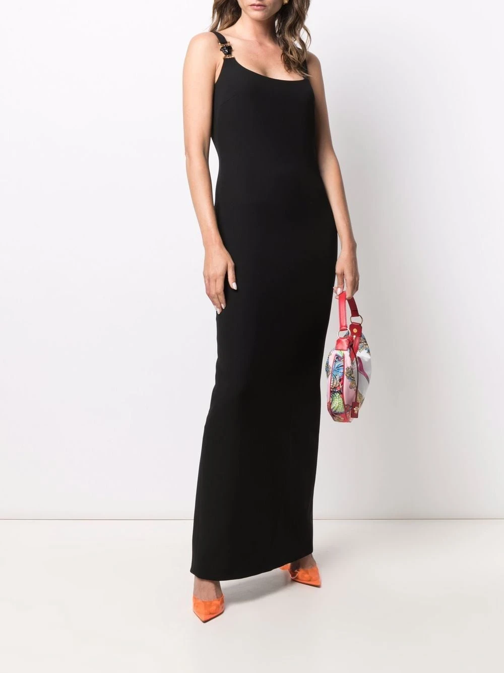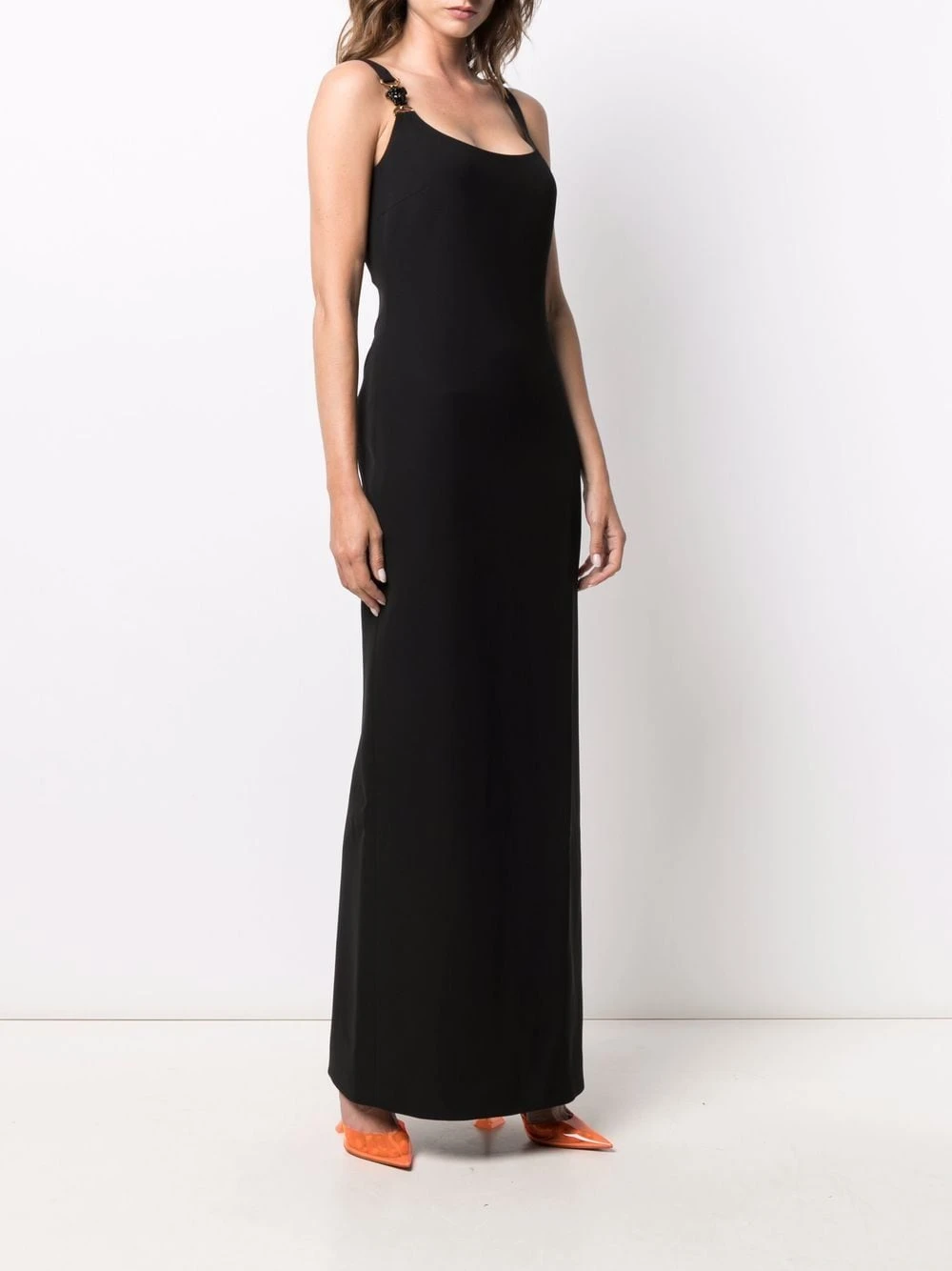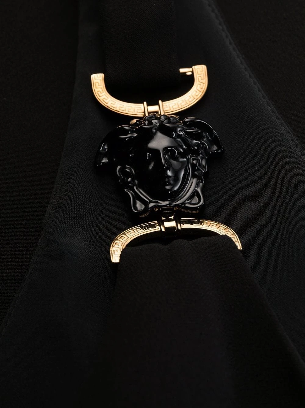 Col arrondi plongeant, col v au dos, design sans manches, coutures ton sur ton, motif Medusa, finitions en métal doré, pinces, coupe slim, fente à l’arrière, coupe longue. Couleur : noir. Matière : soie.