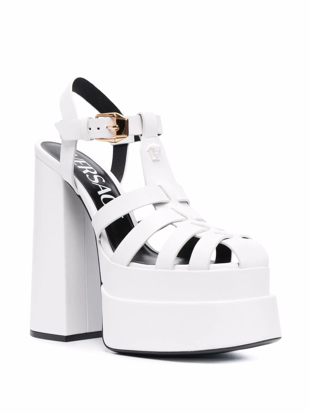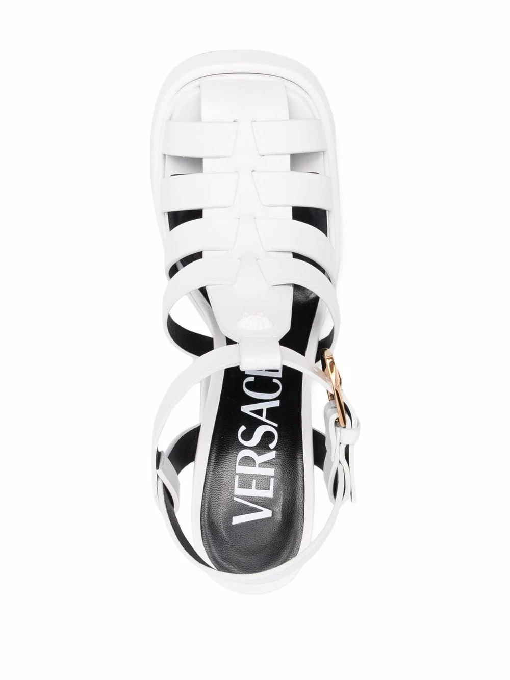 Semelle intérieure à logo, bout ouvert, fermeture à boucles sur les côtés, talon haut épais, finitions en métal doré. Couleur : blanc. Matière : cuir.